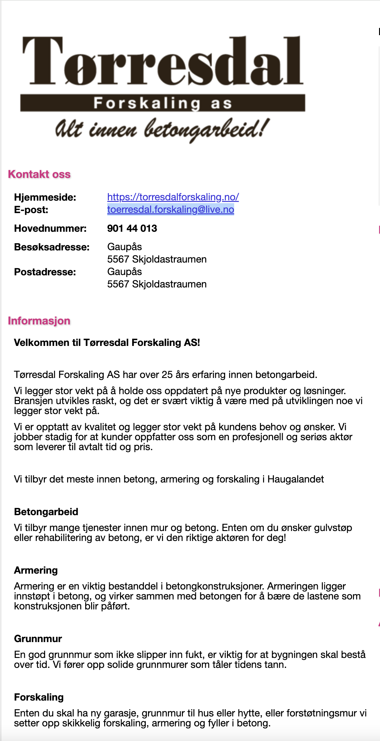 Tørresdal forskaling as Saga Bygg Byggmesterfirma Finshus&Selvåg Signatur Bygg – Norgeshus Teqva Haugesund Aksland Bygg Bømlo Hus avd. Haugesund Vigor Bygg Byggefirmaet Kjellesvik & SeverinsenGrunnarbeid