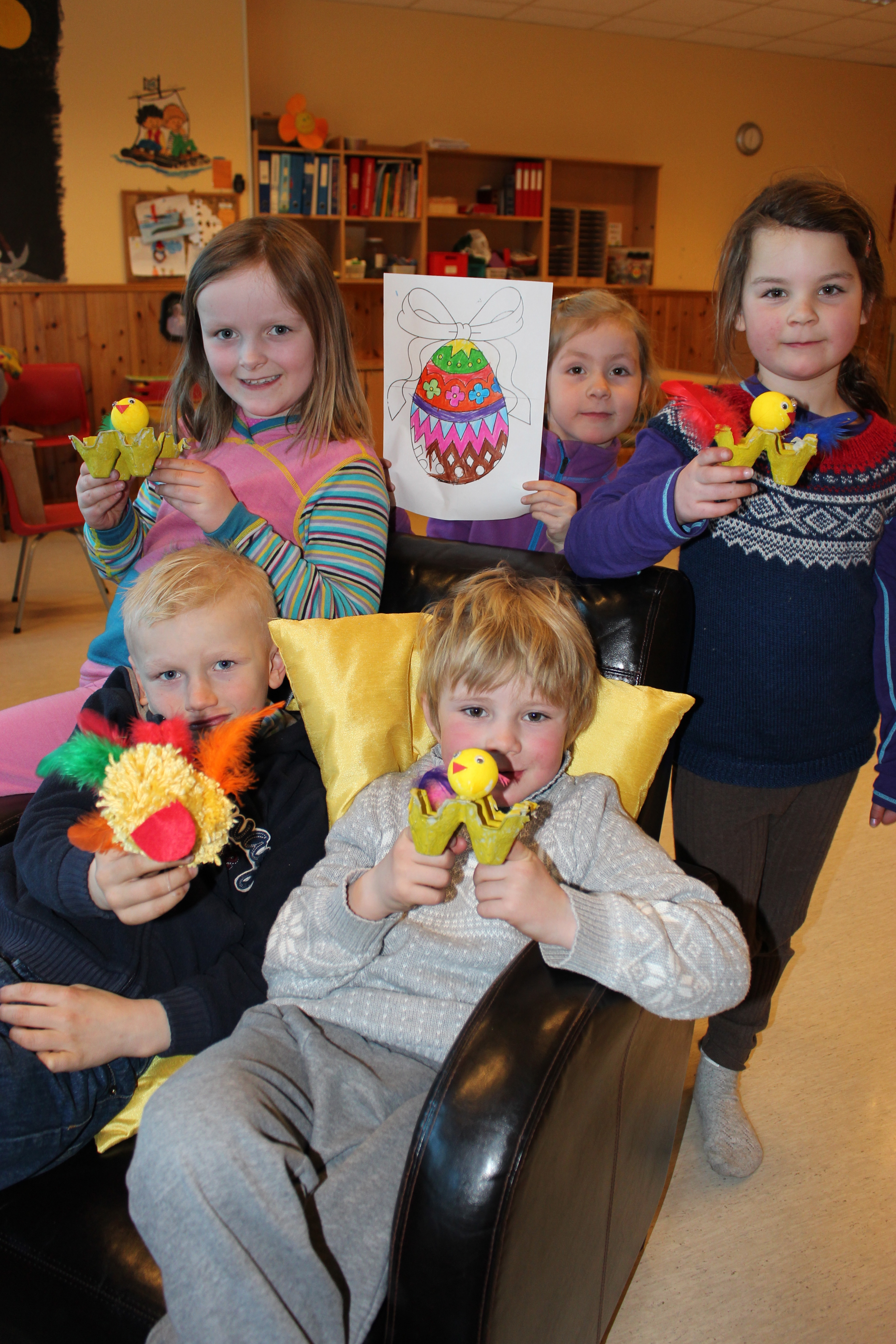 – Jeg har laget denne, sier Erlend Anders Muller (6) stolt og viser fram en gul påskekylling av pappkartong og nøstetråd.
