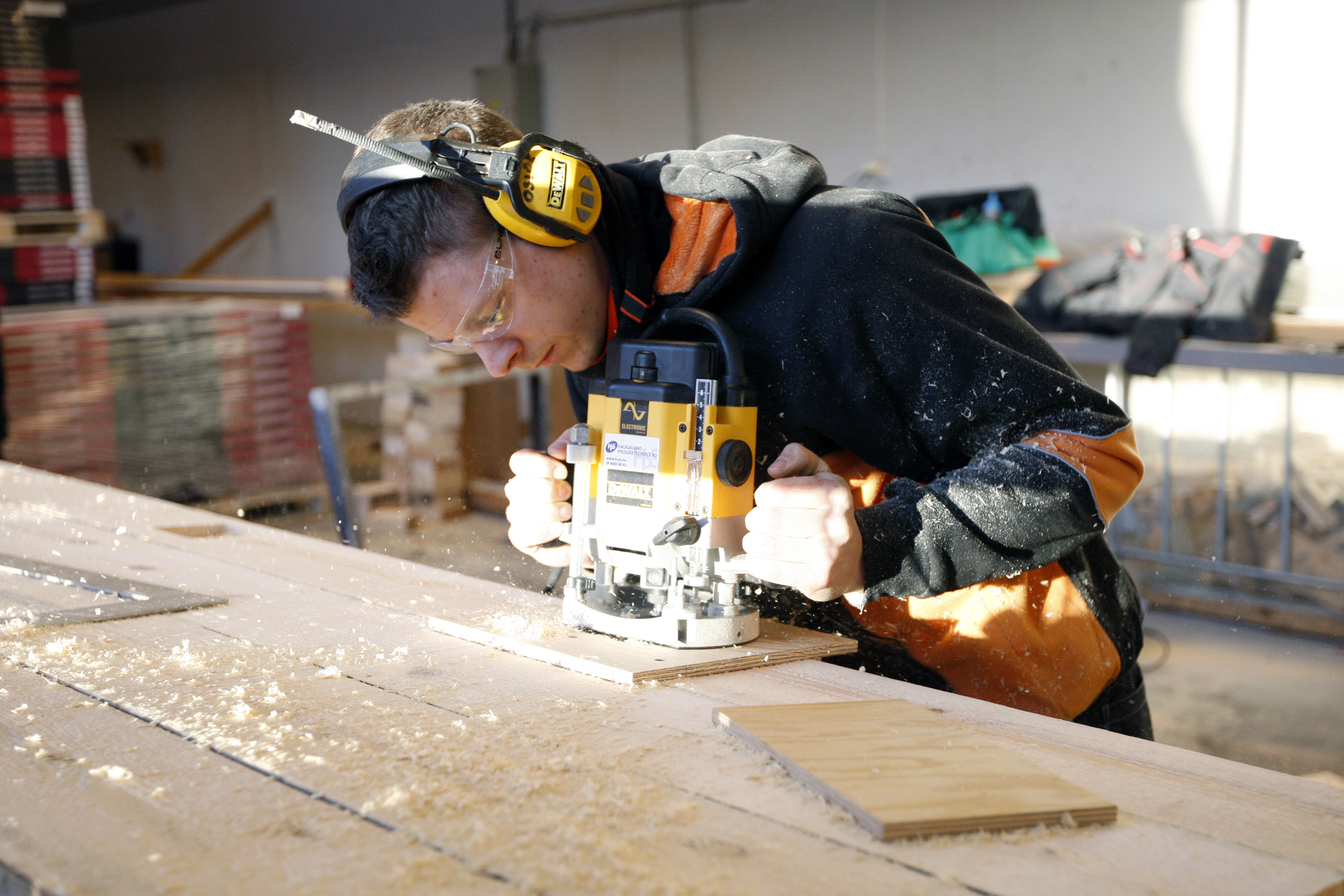 – Me er svært glade for at Optimera låner oss hallen sin slik at me kan gjere mykje av detaljarbeidet inne. Servicebygget skal byggast på gamlemåten og det skal ikkje nyttast spiker eller skruar. Då må fresen gjere jobben, smiler Oddvin Marvik og inspiserer arbeidet til Gunnar Tveit og Thomas Hansen.