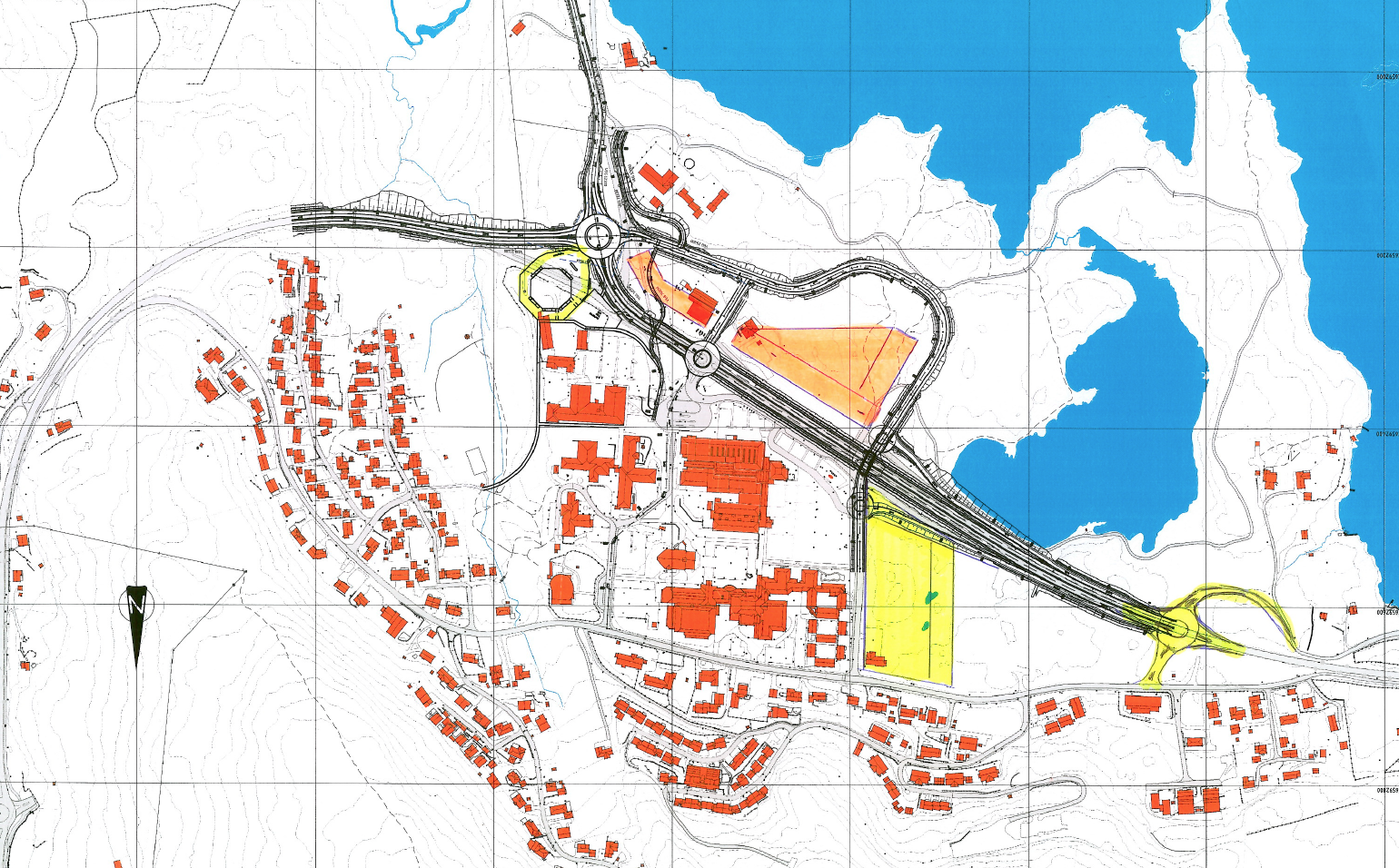 – Området kor eg har teikna inn senteret er heilt i aust mot rådhusvegen og kor eg ser for meg også ei utvikling av dagens parkeringsplass, dagens senter og eigentleg heile området som i dag er sentrum. Innkjøringa frå E134 må komme i ei ny rundkjøring litt lenger mot vest og Aksdalsvegen må rustast opp og vere ein del av trafikksystemet i Aksdal. Avkjøringsrampane som er der i dag kan då takast vekk og ein treng ikkje lokket over vegen, som tidlegare snakka om. Over E134 blir det då berre nærtrafikk, seier Apeland.