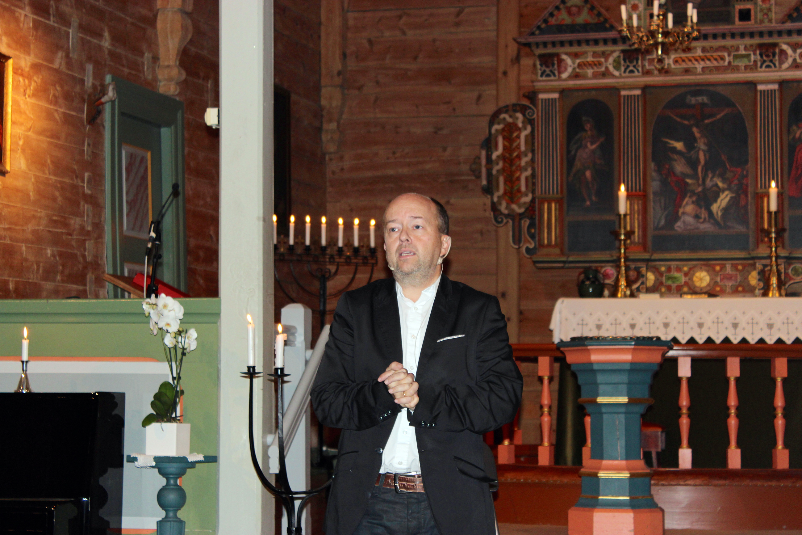 Kyrkja var pynta med levande lys og faklar, og regnet tromma på kyrkjevindauga. I det Sandsmark stiller seg framfor dei tilhøyrande, senker det seg ei knusande ro i rommet. Det er tydeleg at historia om Sara allereie på førehand har gjort inntrykk på mange.