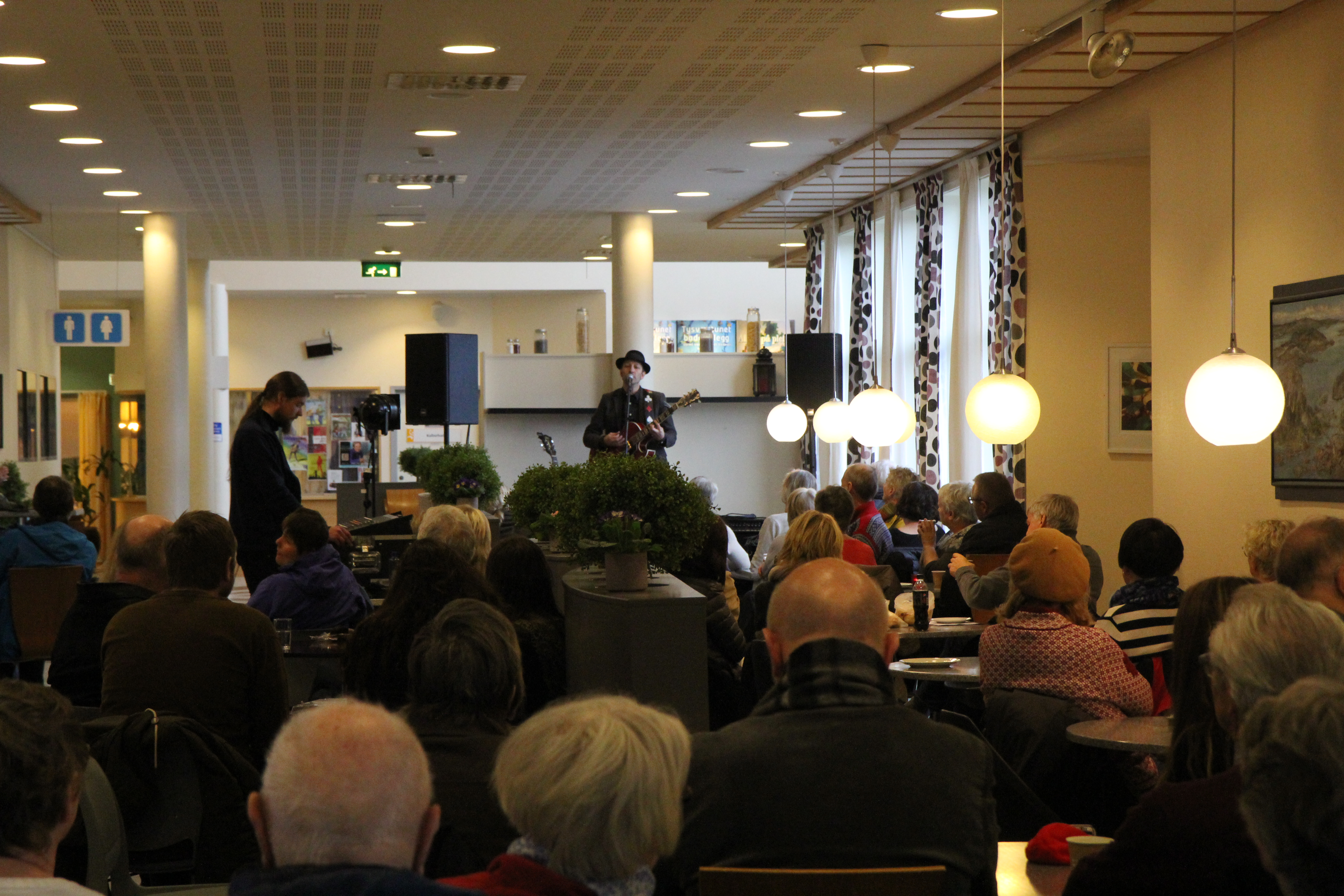 Nærare 80 personar hadde funne vegen til kafeen på Tysværtunet. Dei fekk høyre rykande ferske songar frå albumet «Rapport frå eit grensehotell» som kjem ut i desse dagar.