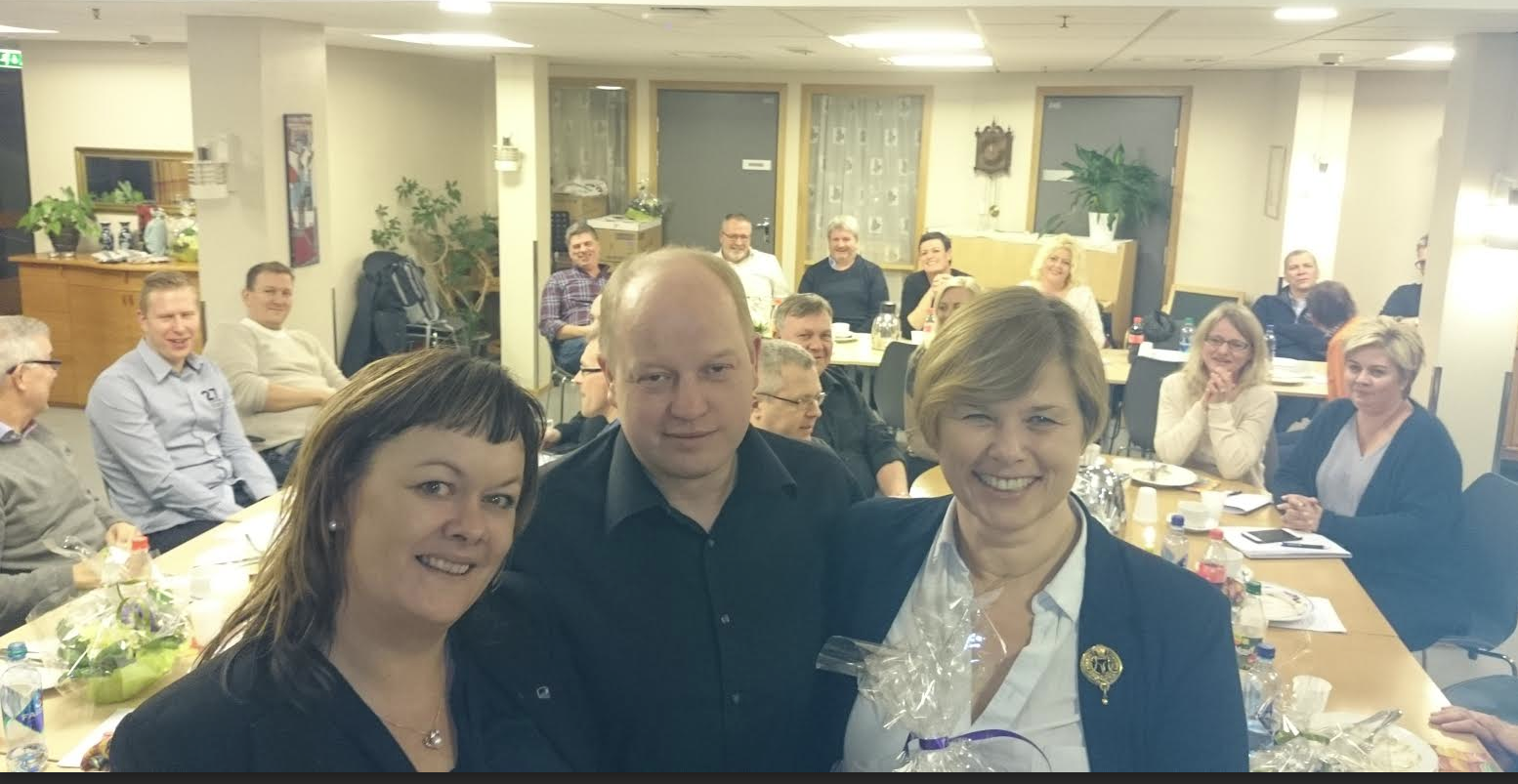 En fornøyd trio med årsmøtegjester i bakgrunn: