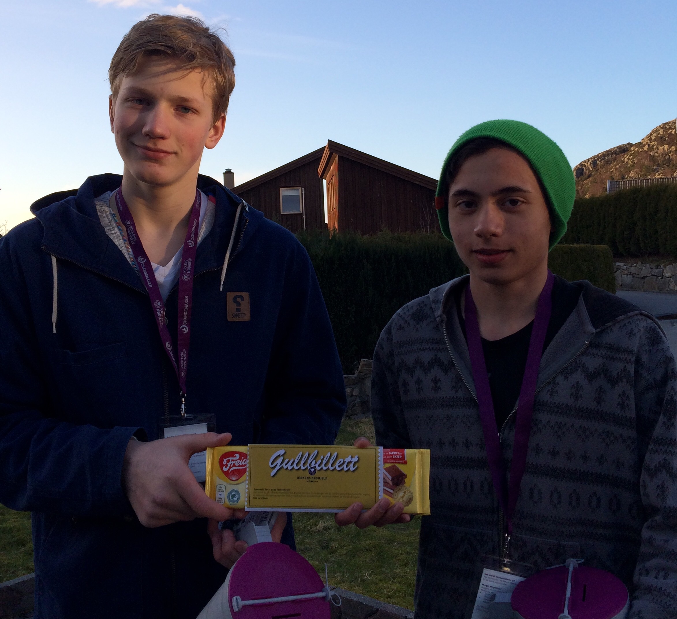 John M. Fagerland og Thorbjørn Olden Tveit var to av mange som tirsdag kveld var på å gjøre en forskjell. Og på en av adressene fikk de ensjokolade med en gullbillett.