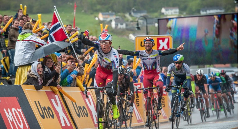 Bruddet rullet kontrollert over den innlagte spurten. Tolhoek foran Podlaski og Austevoll. 73 km unnagjort og avstanden er 6 km. Klokka 14.35. Det er ca. fem minuttar etter det tregaste skjema…