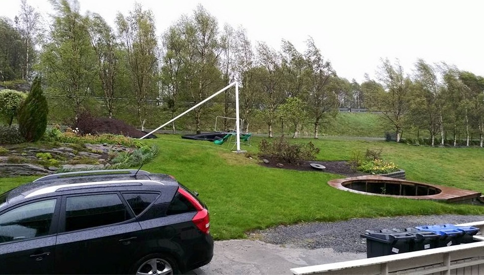 I Aksdal fekk flagstanga til familien Weltzien Dalaker er tøft møte med sommaren. Den knakk på midten. Fleire stadar i kommunen lå det i morgontimane trær over vegen og gjorde det både vanskeleg og farleg å ferdas. Vinden har nå roa seg, og folk blir oppfordra til å sjekke småbåthamnene.