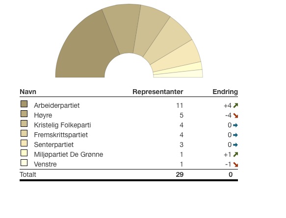 Frp får 13,9 prosent mot 12,8 ved forrige valg – og 4 mandat. Ellers går Venstre tilbake fra 5,3 til 3,7, (ett mandat) og Krf frem fra 12,7 til 14,1 prosent (4 mandat).
