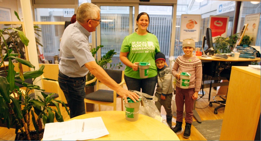 Maren, Mathea og Alfred Økland kom med ein sekk bøsser til banken i Aksdal. Dermed kan oppteljinga for årets TV-aksjon ta til.