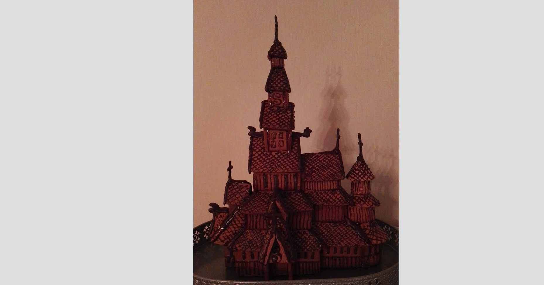 Det ligger mange timers jobb bak, men han synes dette er kjekt. Det har blitt en tradisjon for ham å lage stavkirker, når han er på jobb i Nordsjøen, men i år ble det kollisjon med eksamen og det gjorde at det var vi her hjemme som fikk gleden av denne.