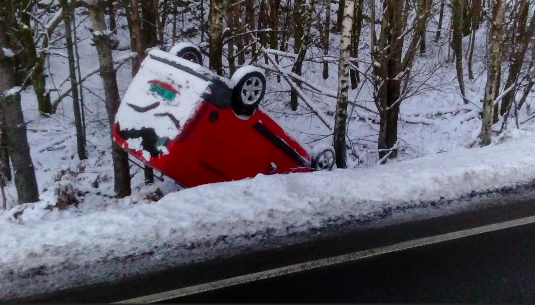 Det ligger en bil på taket som har ligget slik siden sist helg. Dette er på FV. 515 rett før nedkjøring til steinknuseverket i Espevik.