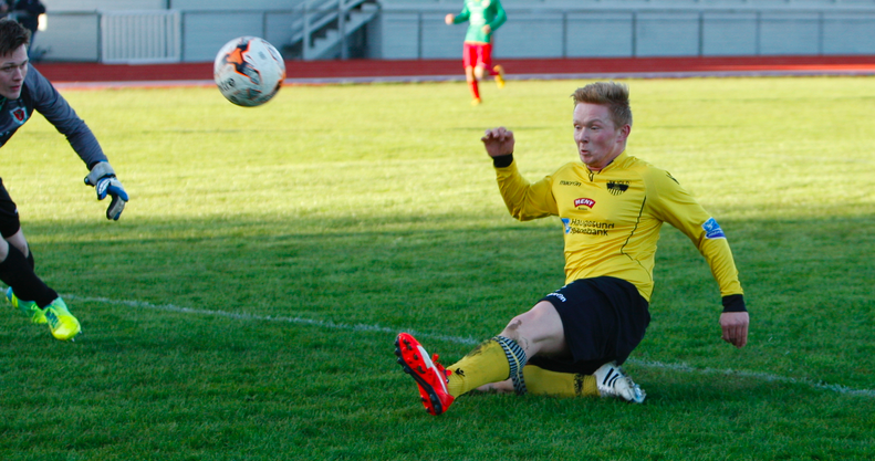 Han sto for Skjold sin eneste sjanse i 1. omgang. Et halvfarlig skudd strøk stolpen og gikk utenfor.