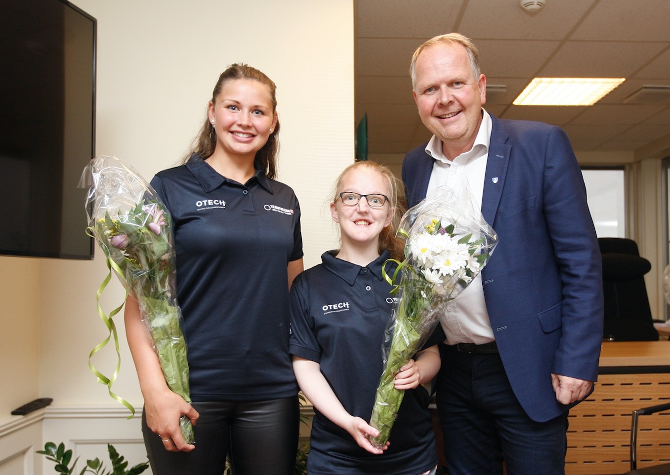 Sigmund Lier blei så glad, og så imponert at han med ein gong inviterte dei to spreke Tysvær-jentene til sitt kontor. Og med blomar og eit par gåver frå kommunen takka han dei begge for at dei er førebilete for svært mange andre.