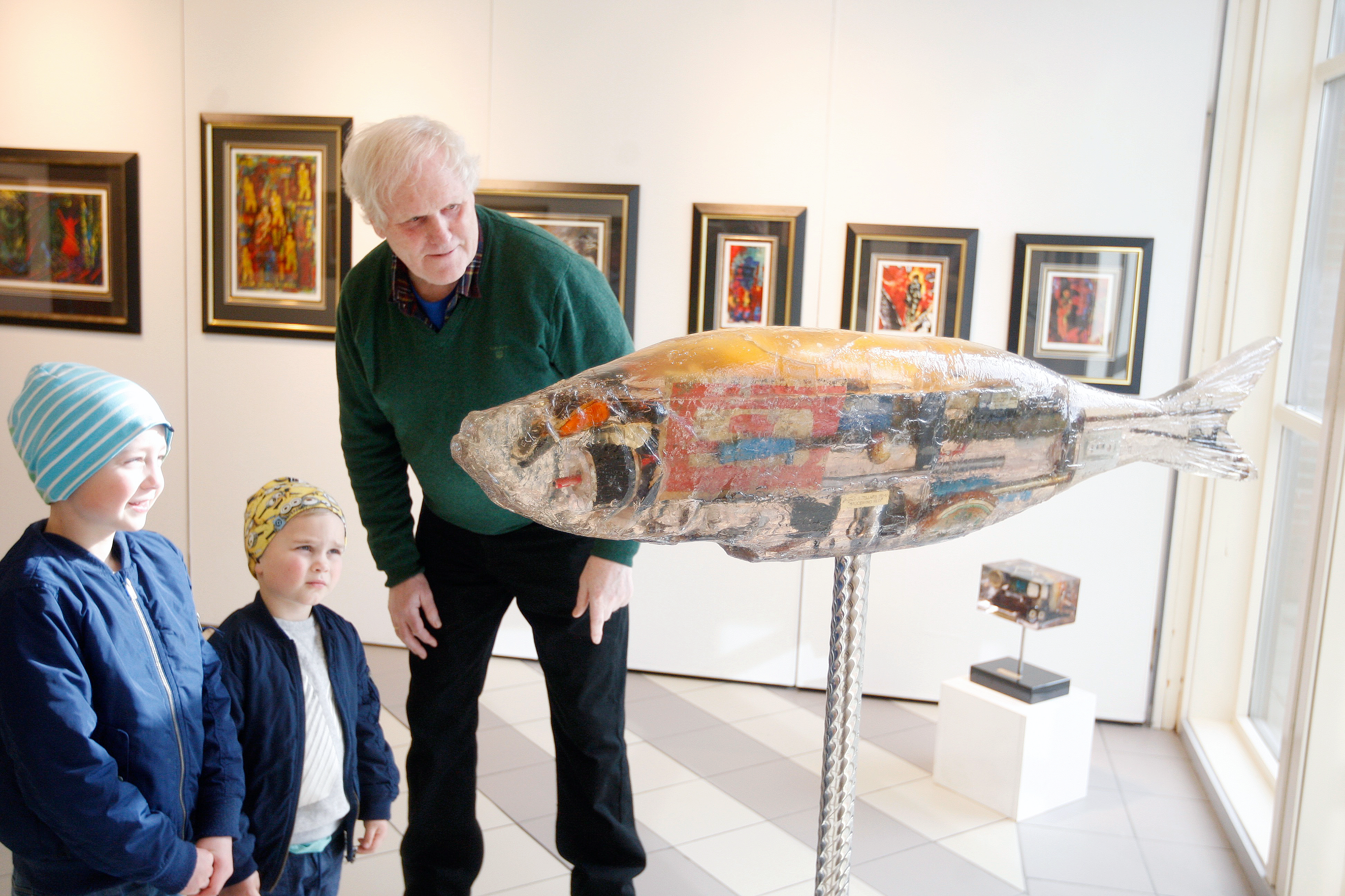 Han stråler nærast om kapp med bilda der han viser rundt og forklarer historia bak kvart enkelt bilde, og ikkje minst om korleis han i årevis har jobba med ein stor glassfisk, fylt med søppel frå Smedasundet.