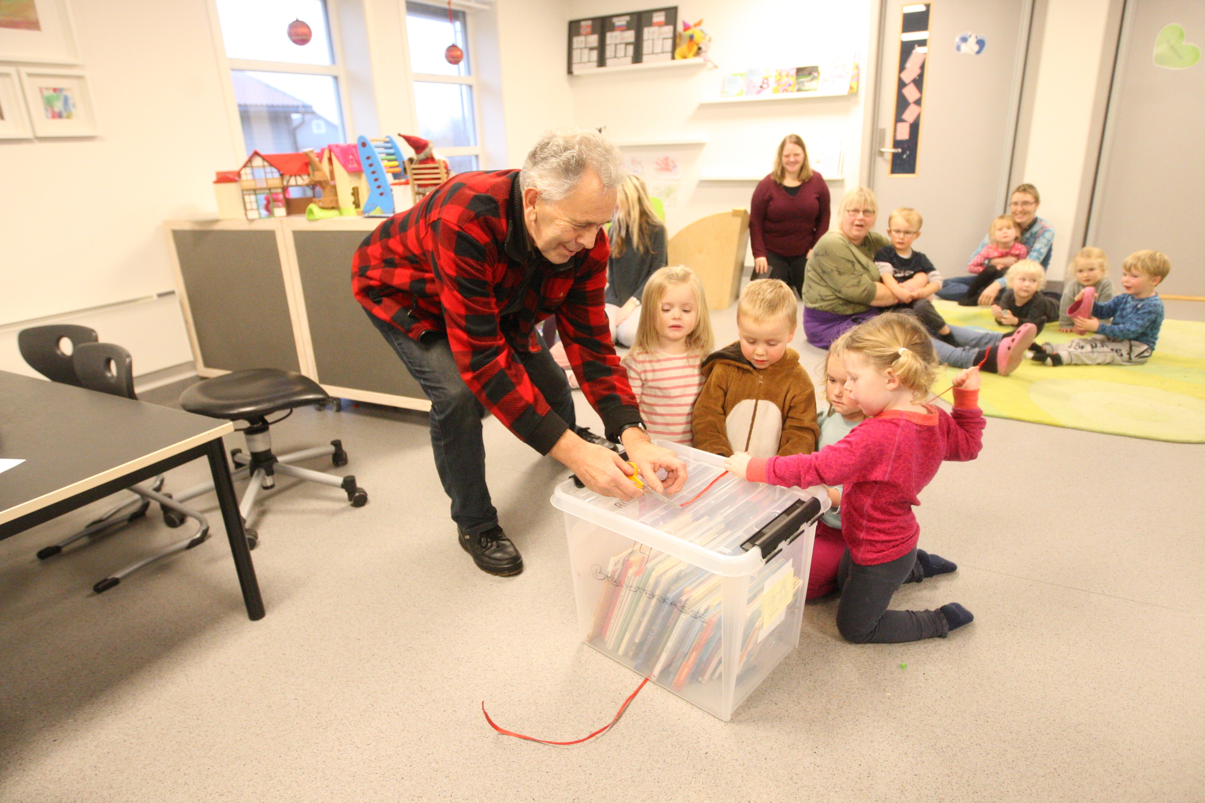 Det var god stemning både under lesestunda og opninga av bokkassen. I det bandet var klippa av, var det kamp om bøkene.