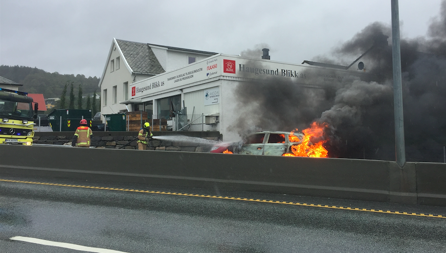 Det var like etter klokken 13 at vi fikk melding om en bilbrann i Førresfjorden. En bil med kurs for Haugesund hadde tatt fyr like ved avkjørselen til kirken og skolen på E134. Da Bygdebladet var på stedet like etter sto bilen i full fyr. Vi kunne ikke se personer i bilen, og det var heller ikke helsepersonell som kom til brannen. Brannmannskap fra både Aksdal og Haugesund rykket ut. Trafikken ble omdirigert rundt Førresbotnen.
