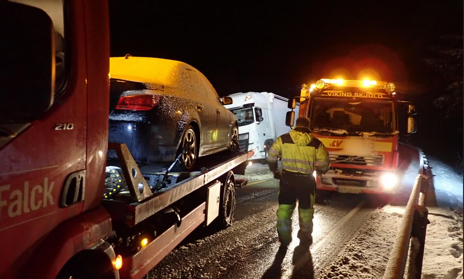 Fortsatt trafikale problemer på stedet. Politiet bistår med trafikkdirigering. Det er rekvirert bilberger til traileren. Flere personbiler sliter også med å komme opp bakken.