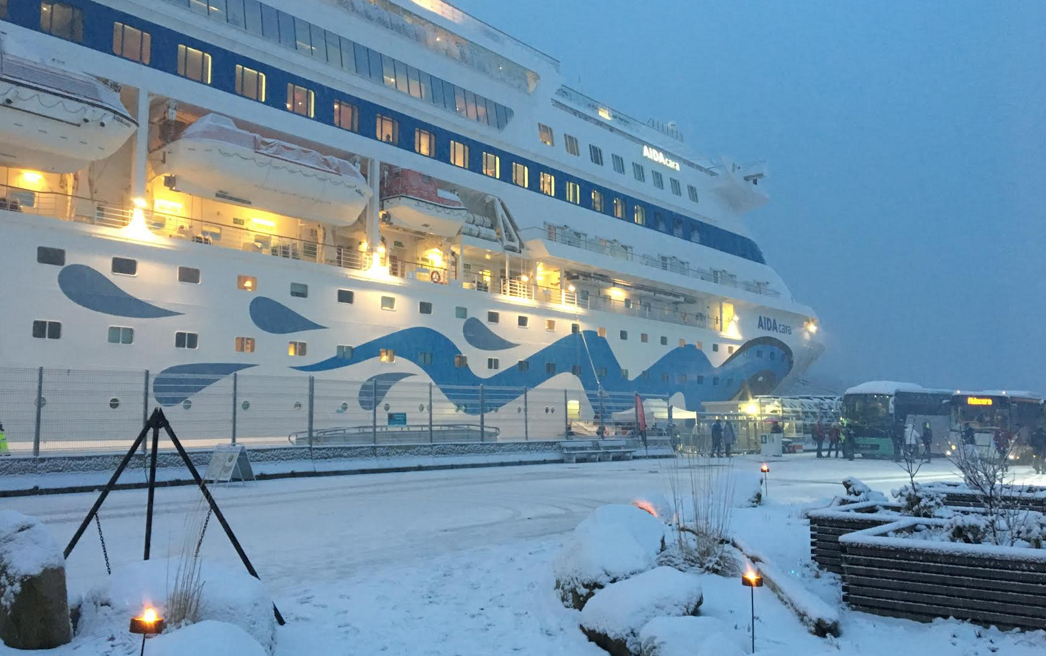 Mandagens besøk med 1300 passasjerer, stort sett tyskere, er på vintercruise til Alta, på jakt etter nordlyset.