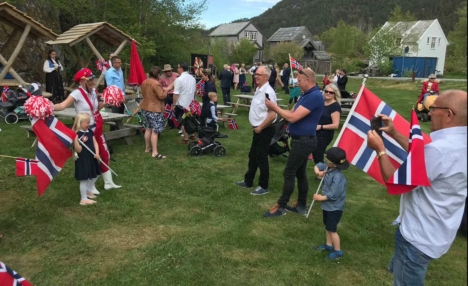 17 mai feiring på Borgøy. 58 store og små gjekk i tog fra Hattarvågen te Østebøvik. Etterpå var det grilling, kaker og kaffe nede på bakken. Lykkehjul og kaste-på-boks.