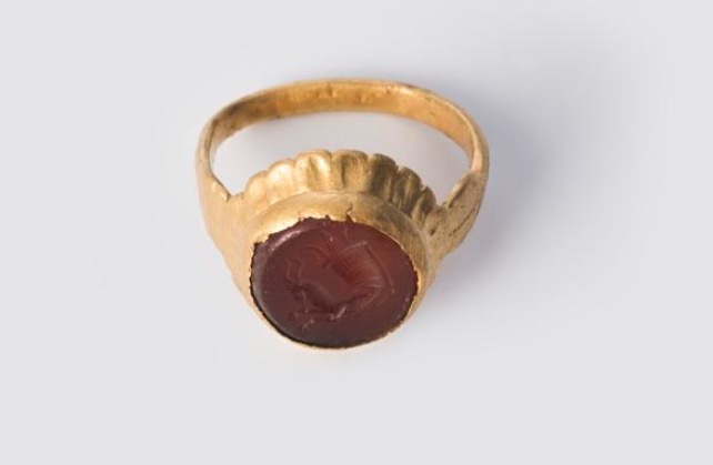 Ringen beskrives som følger: Det er en gullring med smykkestein av karneol. På selve steinen er det inngravert symboler fra gresk mytologi. Gullet er bløtt og ornamenteringen er slitt. Det er tydeligvis en mannsring, og vekten er 9.9 gram.