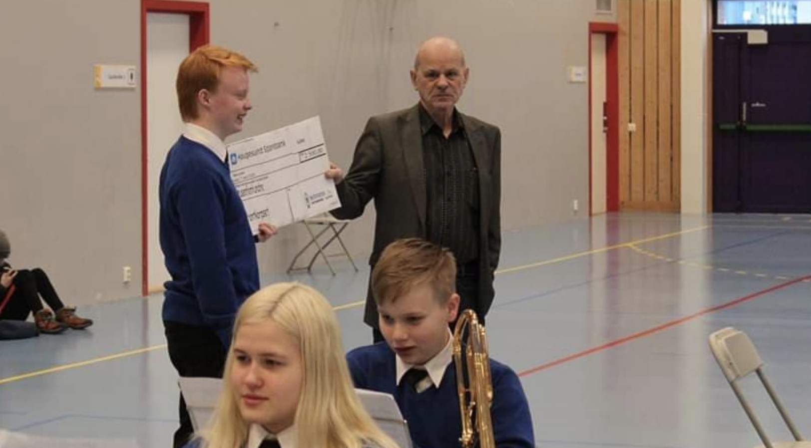 Korpset ble også overrasket med en gavesjekk på 2500,- under basaren. Den ble overrakt til Kristoffer Antonsen tillitsvalgt for medlemmene i Frakkagjerd Skolekorps.