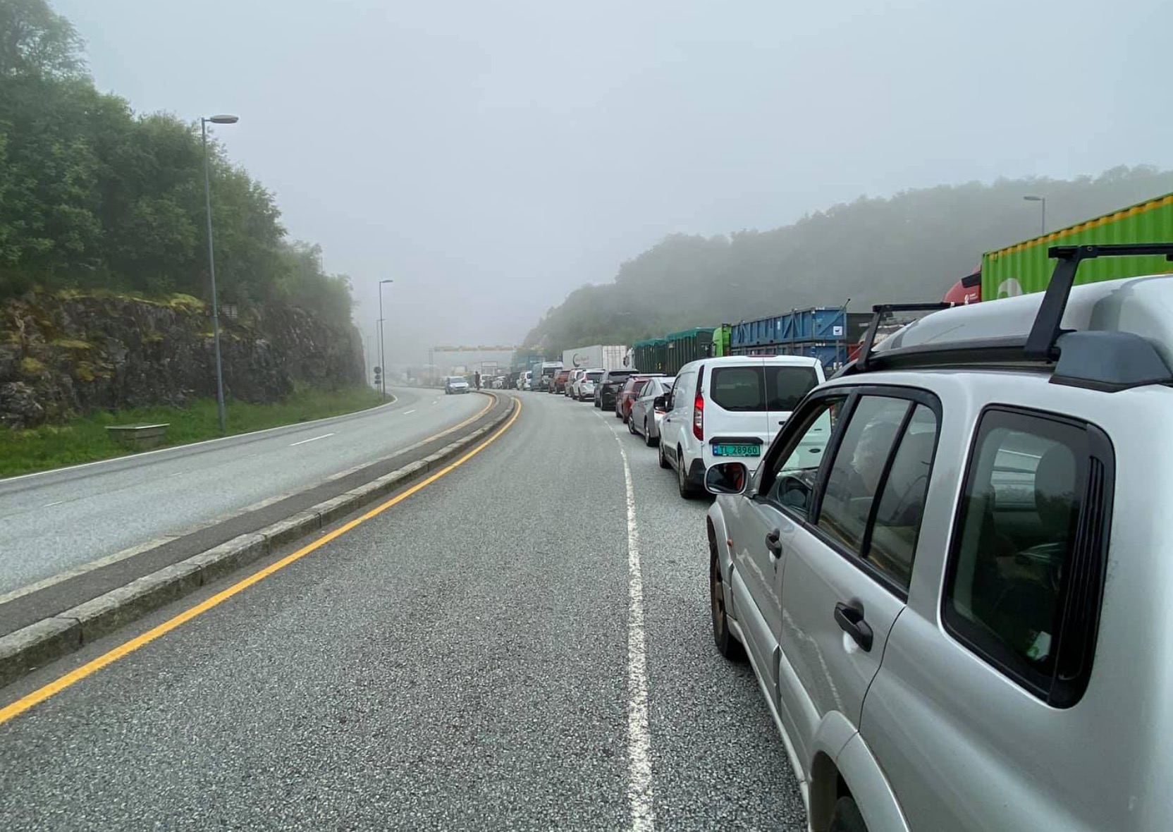 Klokken 10 var det fortsatt ingen ferge som kunne legge til i Sandvikvåg. Løssalgavisene og de som skal i postboksene er ombord i fergen som venter på å legge til.