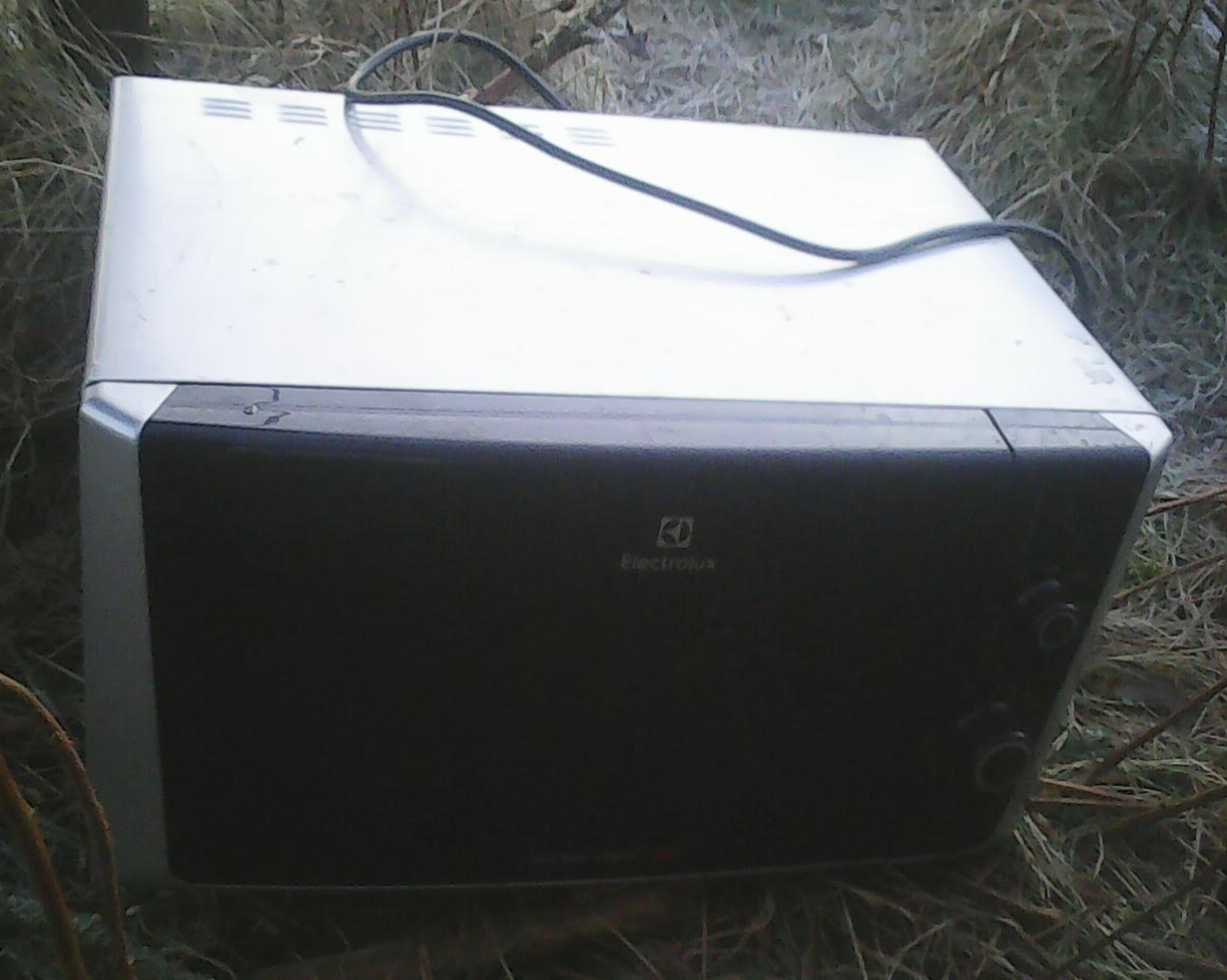 Turgåere ved «Straumene» i Tysværvåg reagerer på at noen har kastet fra seg en mikroovn like ved parkeringen. dette er et elektrisk apparat som neppe forsvinner av seg selv.