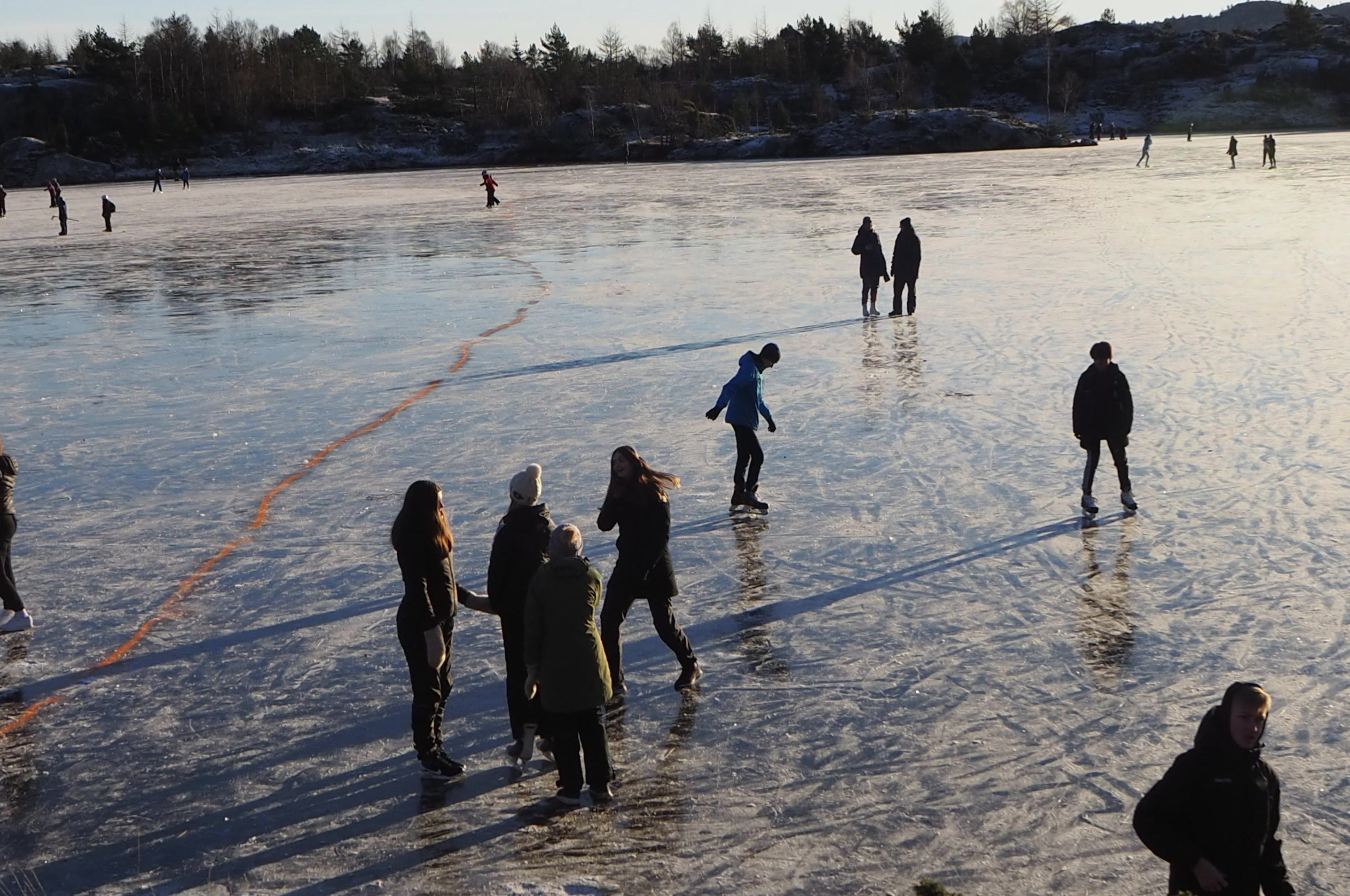 Knut-Arild Sørensen i Friluftsrådet Vest har sendt oss disse bildene fra Aksdal skøytestadion, eller Bongsatjørnet, som det også kalles. Stor aktivitet og elever fra flere skoler der i dag.