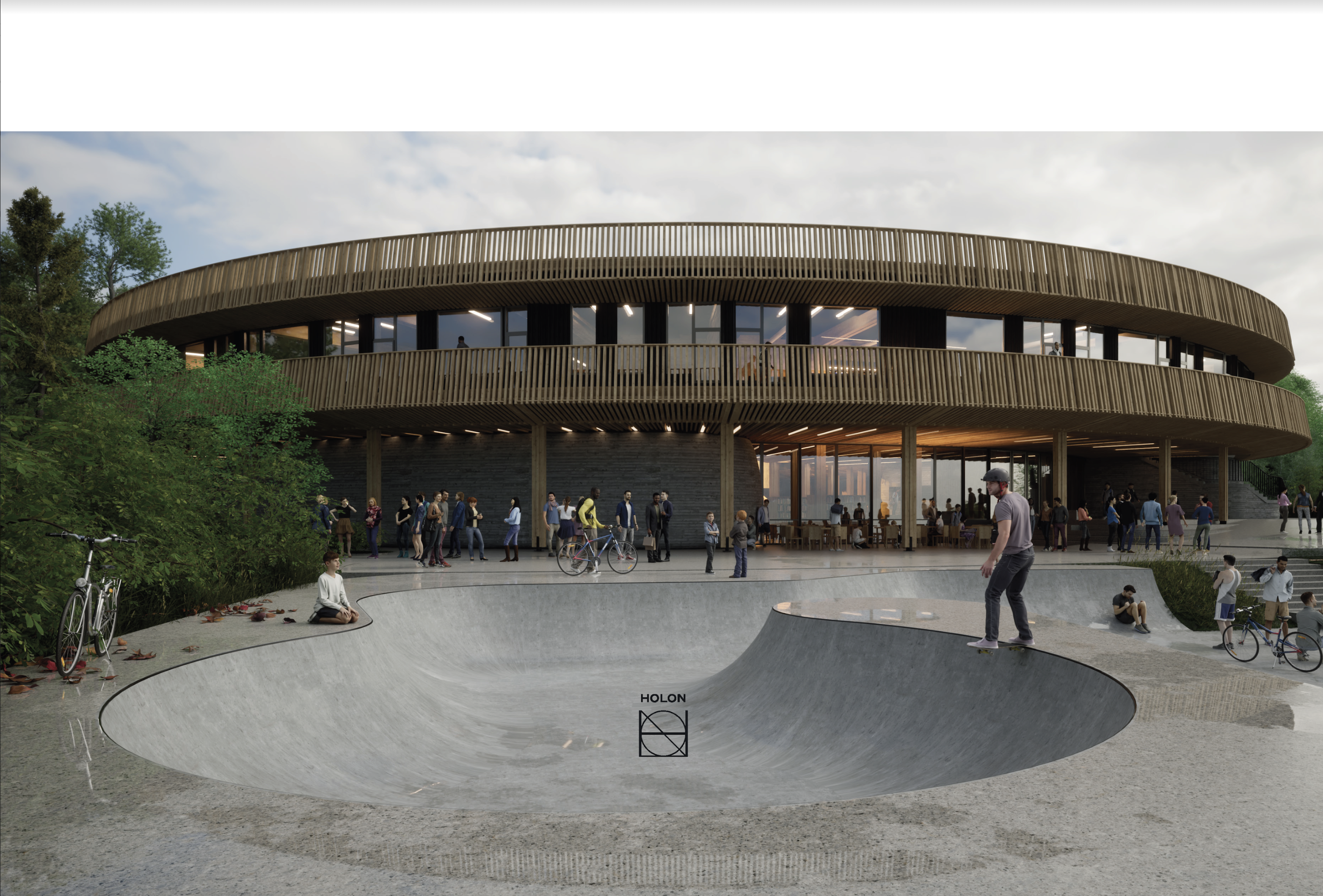 Slik vil nye FUS se ut fra sør like ved rulleparken. «Illustrasjon: Holon Arkitektur AS.Bilde 1 av 8