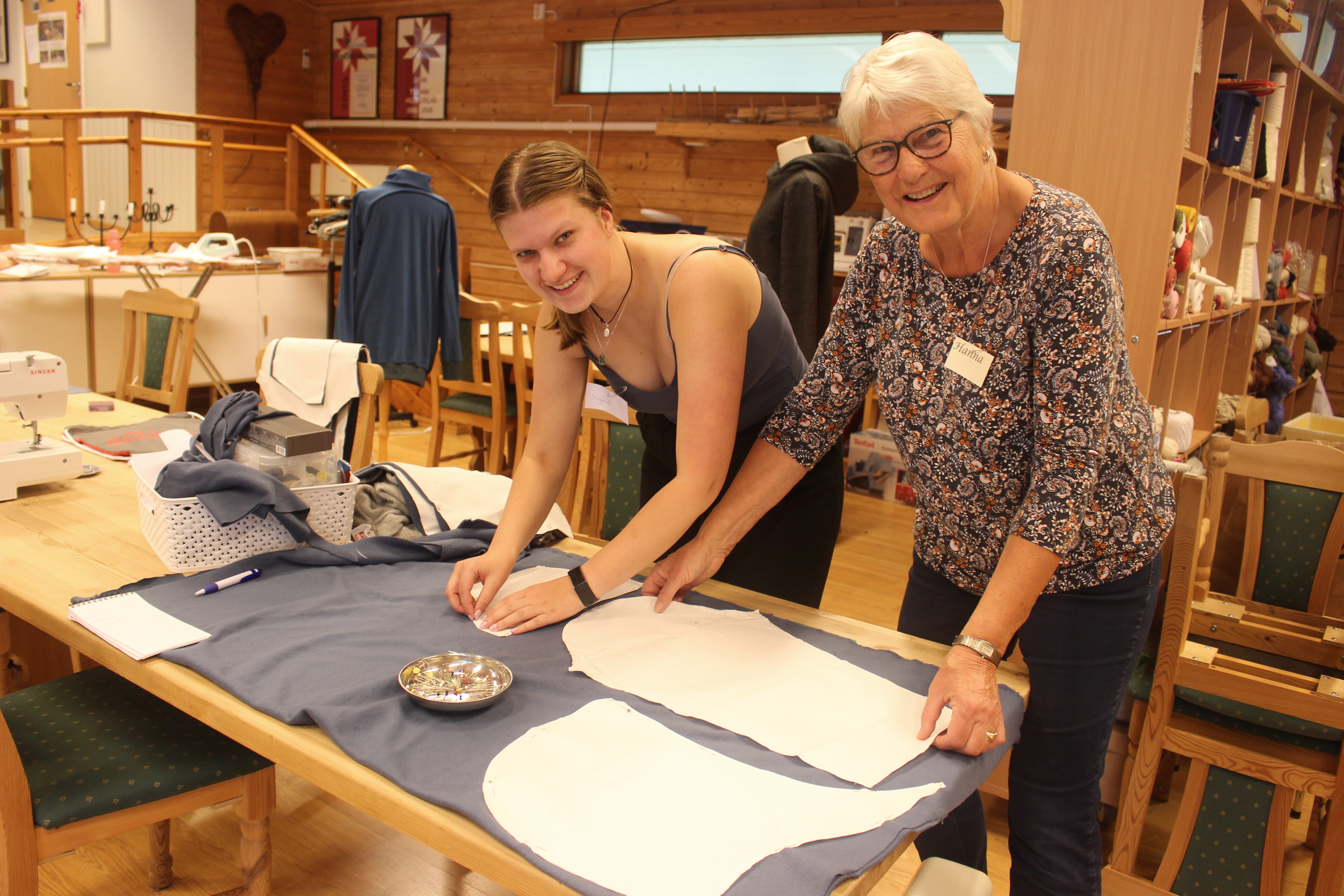 Sigfrid er ikkje heilt nybegynnar, men det er godt å få hjelp av ei erfaren syerske som Hanna Vestre. Foto: Marit Tvedt