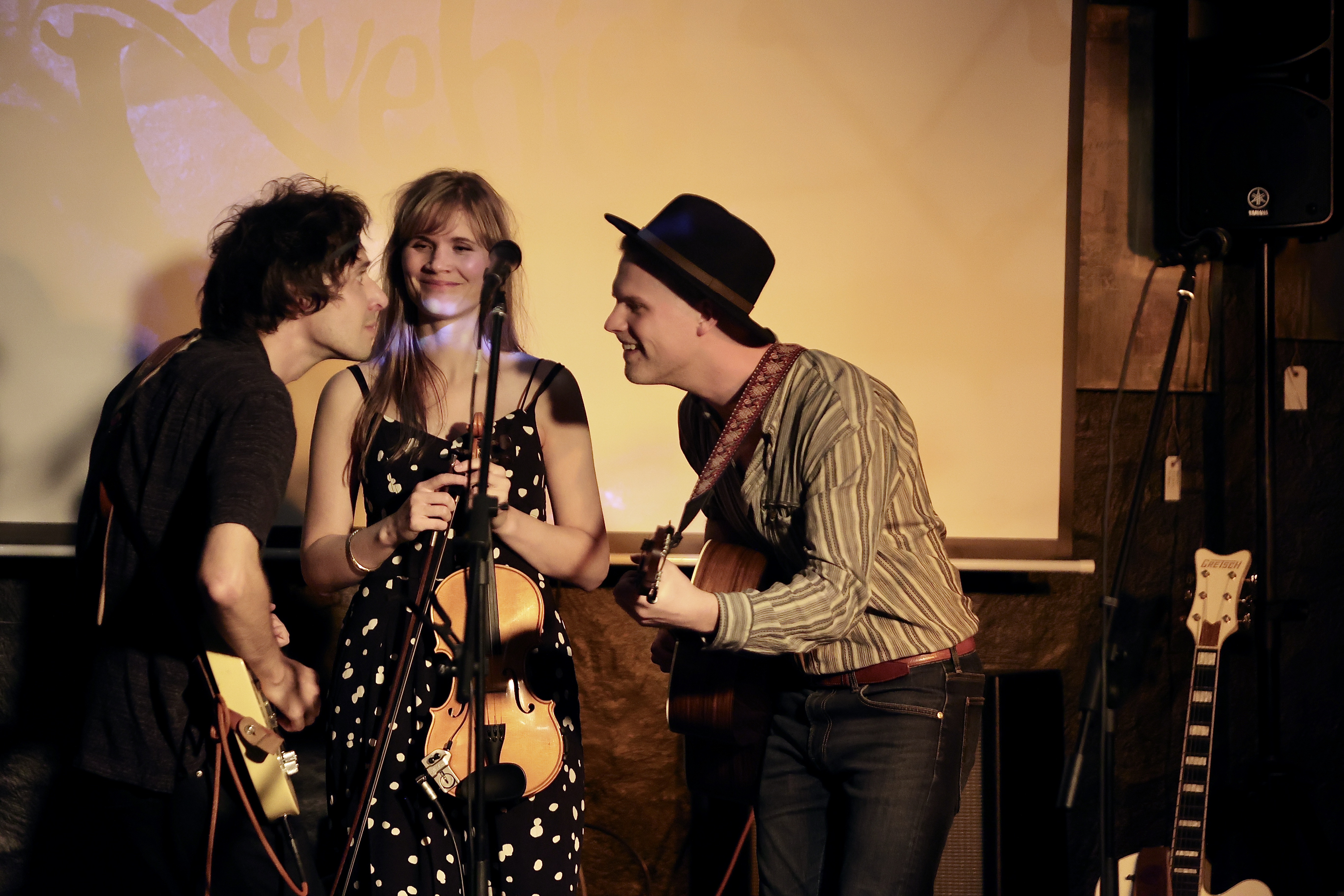 Men nå er det heilt ny og eigenkomponert musikk det handlar om i formatet to gitarar og ei fele som instrument, og tre særprega stemmer på vokal. Med dialekt frå Røros, Egersund og Haugalandet.