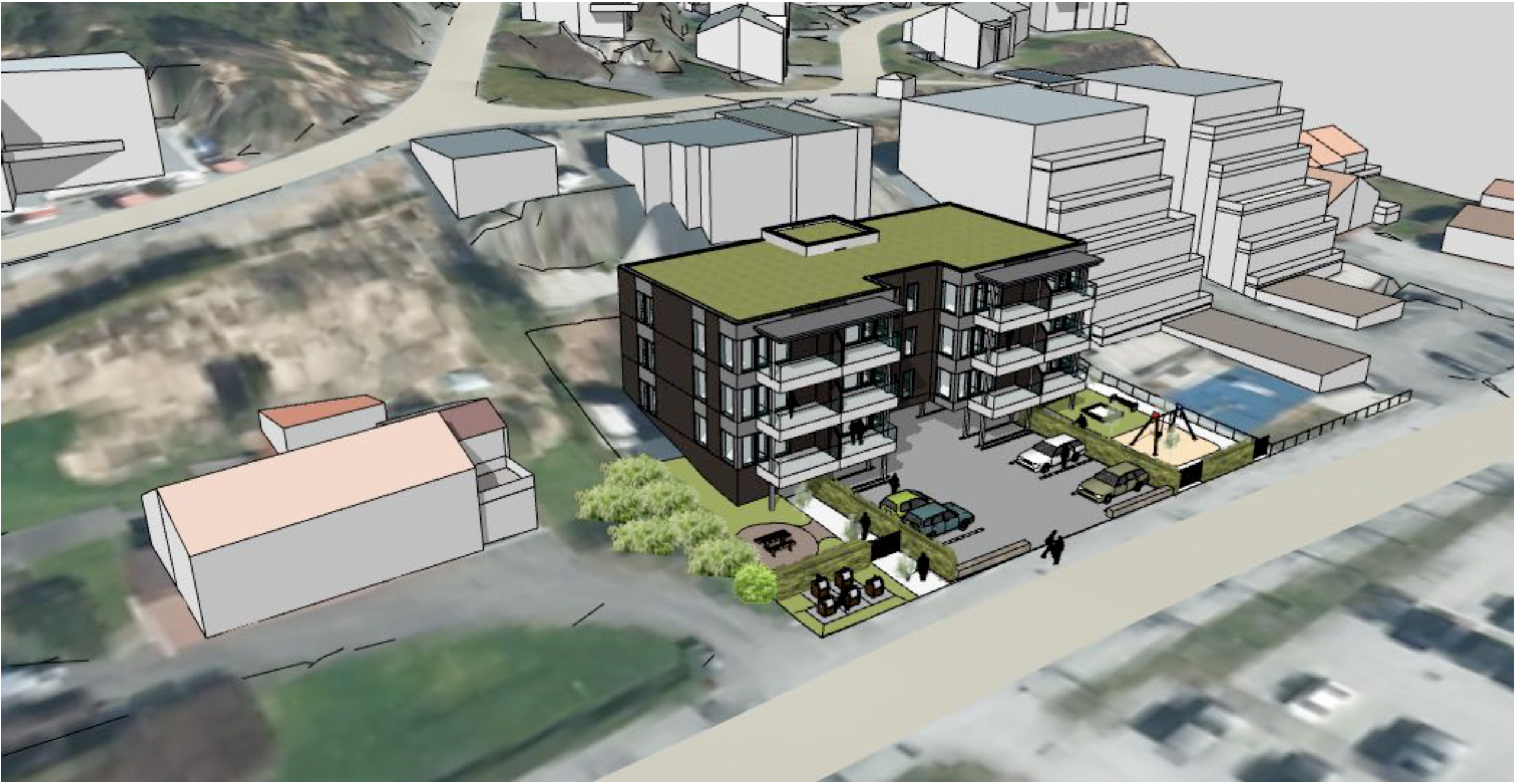 Slik vil det nye leilegheitskomplekset sjå ut, i alle fall i grove trekk, for alt er enno ikkje heilt på plass.
