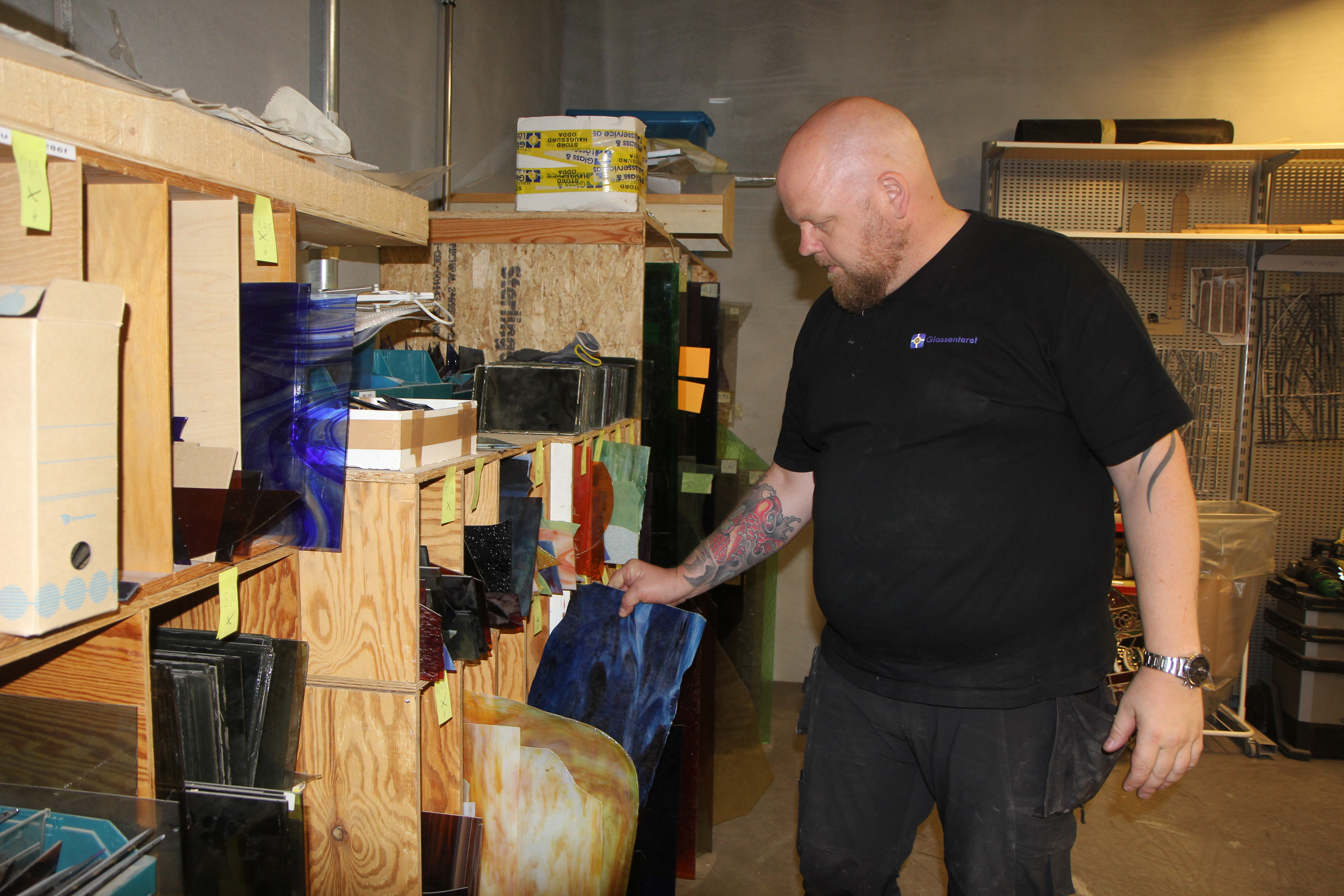 Heine Asheim tar frem glass som han bruker til å restaurerer blyglassverk FOTO: Siri Storesund HanssonBilde 1 av 1
