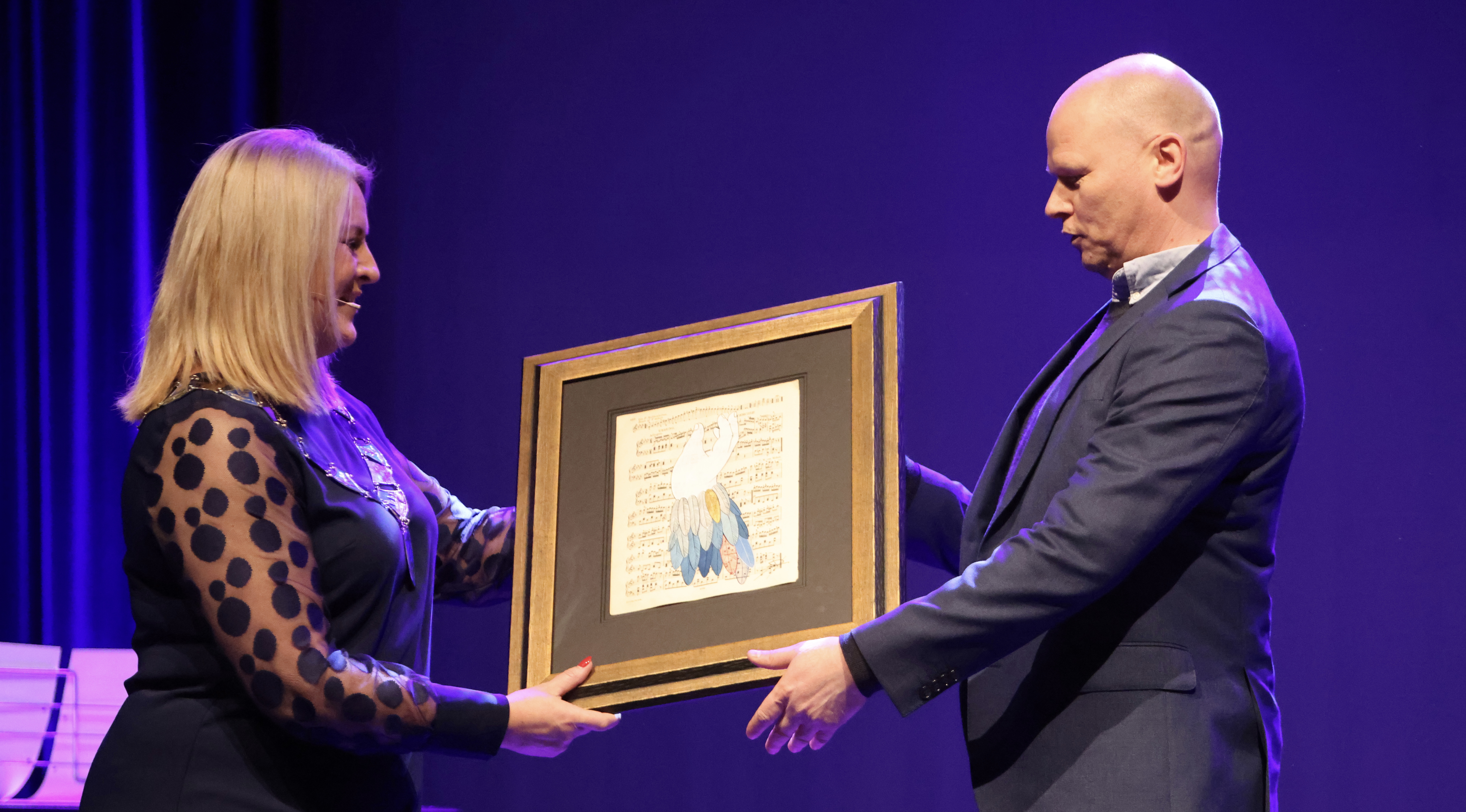 Næringslivsprisen: Hatteland Technology AS ved Jan Axel Roness. Prisutdeler ordfører Monika Lindanger. Foto: Alf-Einar Kvalavåg