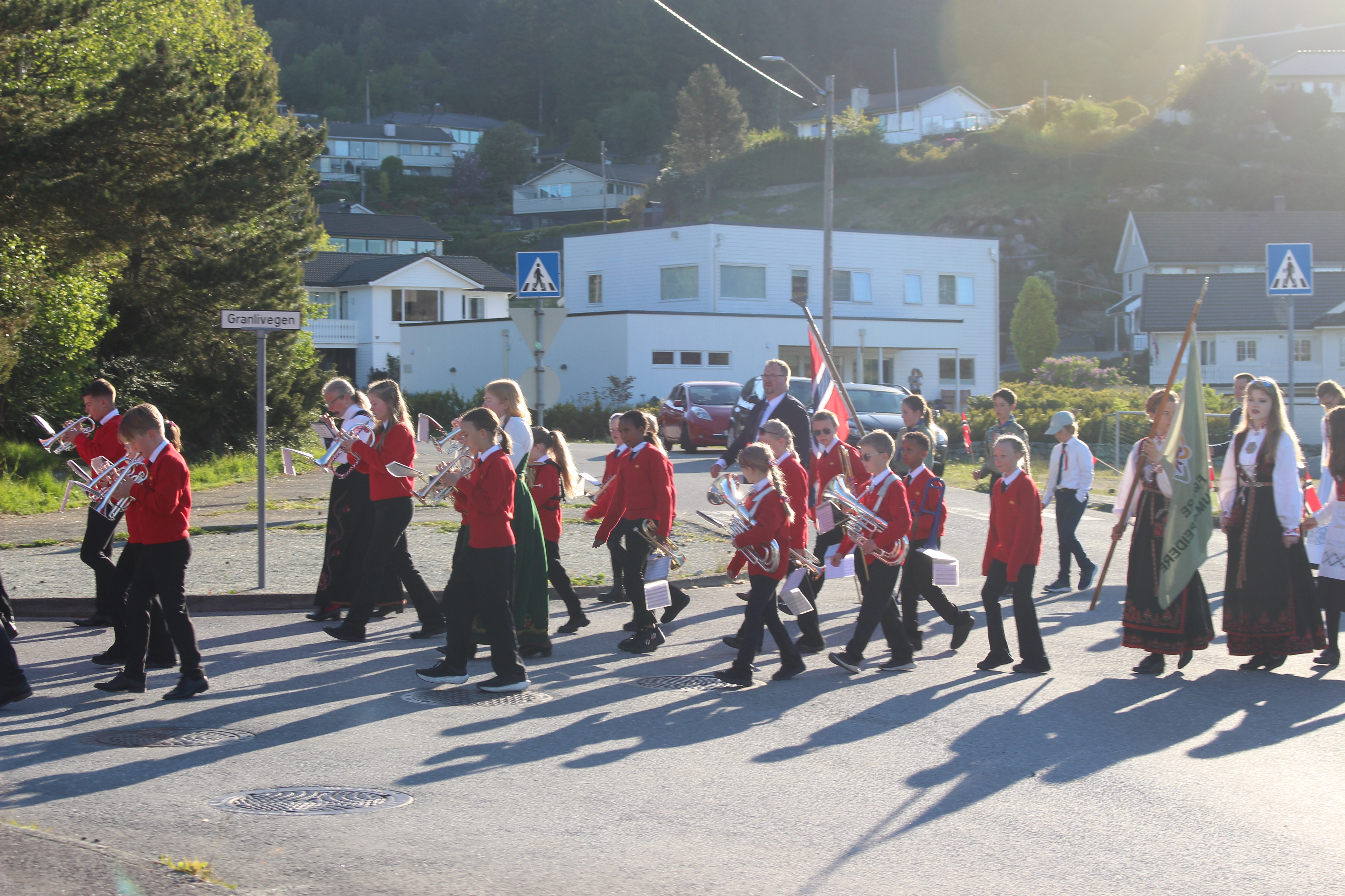 Korpset i strålande, men låg sol, i taktfast vandring gjennom bustadområda.