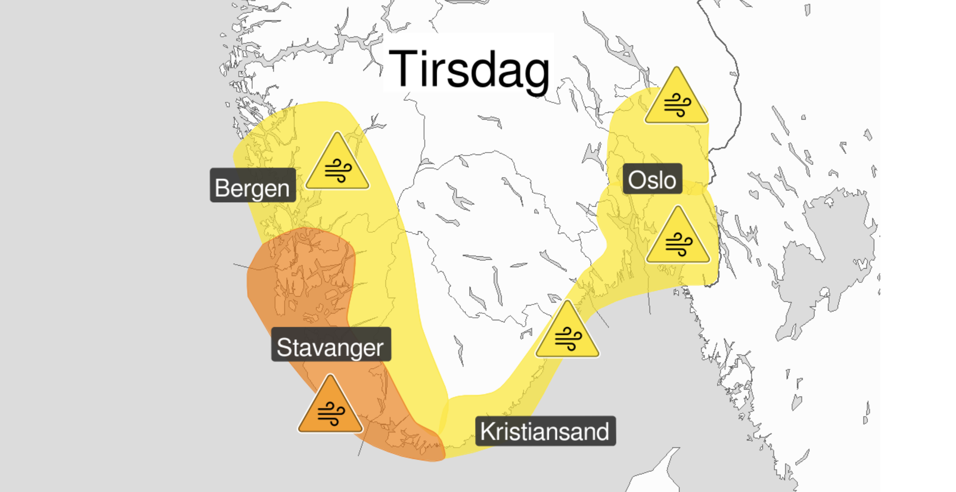 Metrologene har sendt ut varsel om vind på Oransje nivå for tirsdag