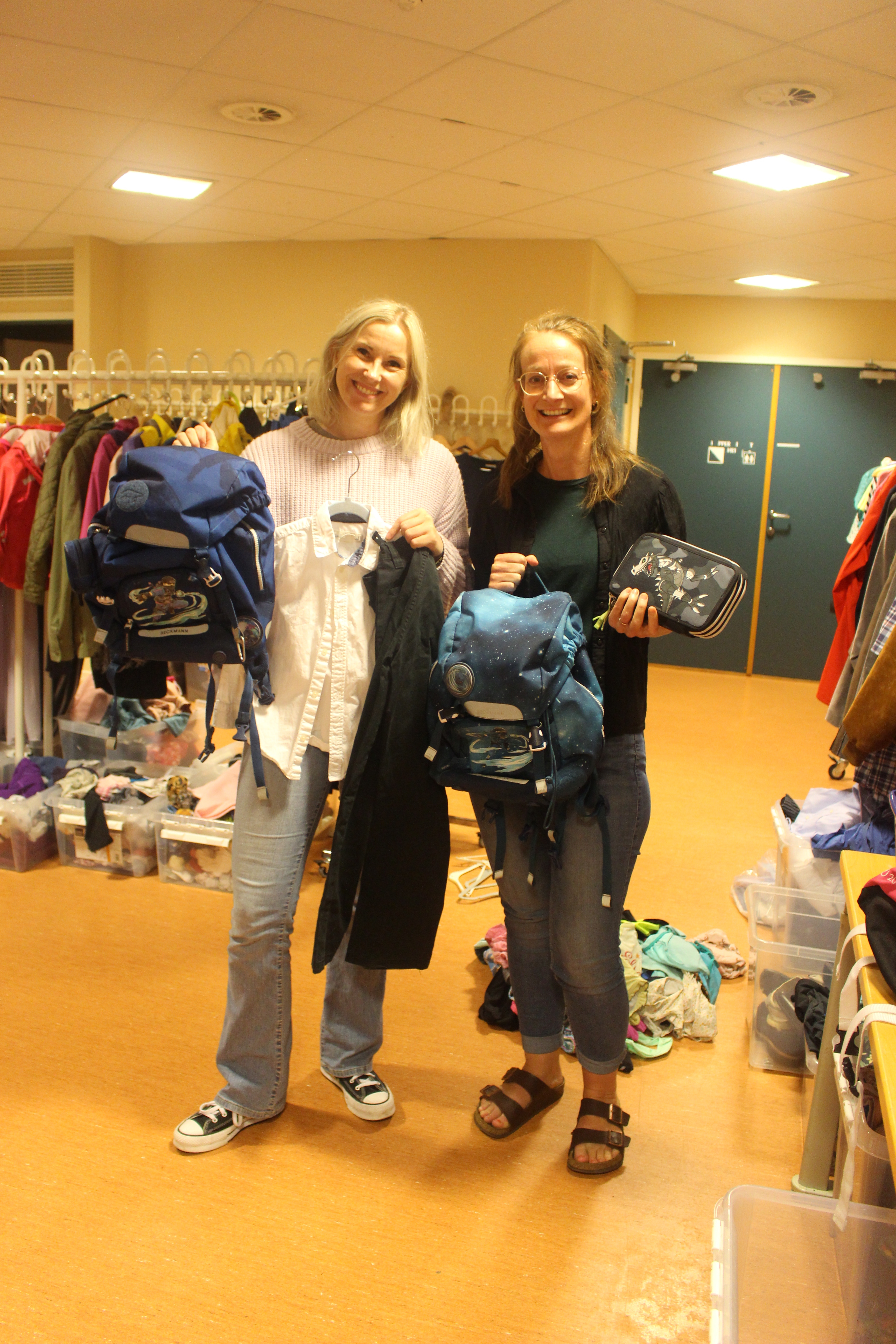 Me har mykje fint utstyr som passar til skulestart, seier frivilligleiar Grethe Vangsnes og diakon Synnøve Svensson Haakonseth.