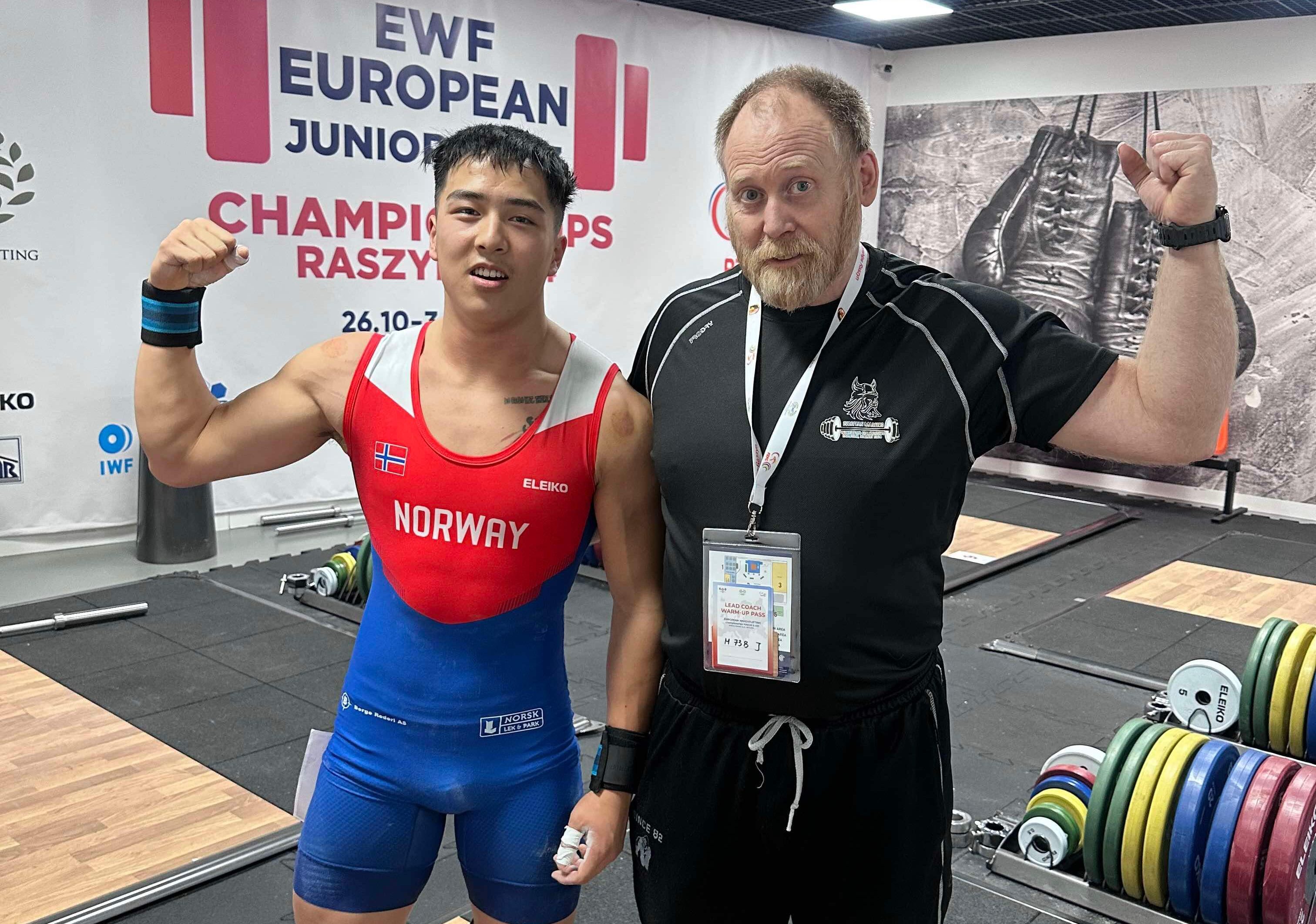Stefan Rønnevik og traner Dag Rønnevik under EM i junior Vektløfttning.