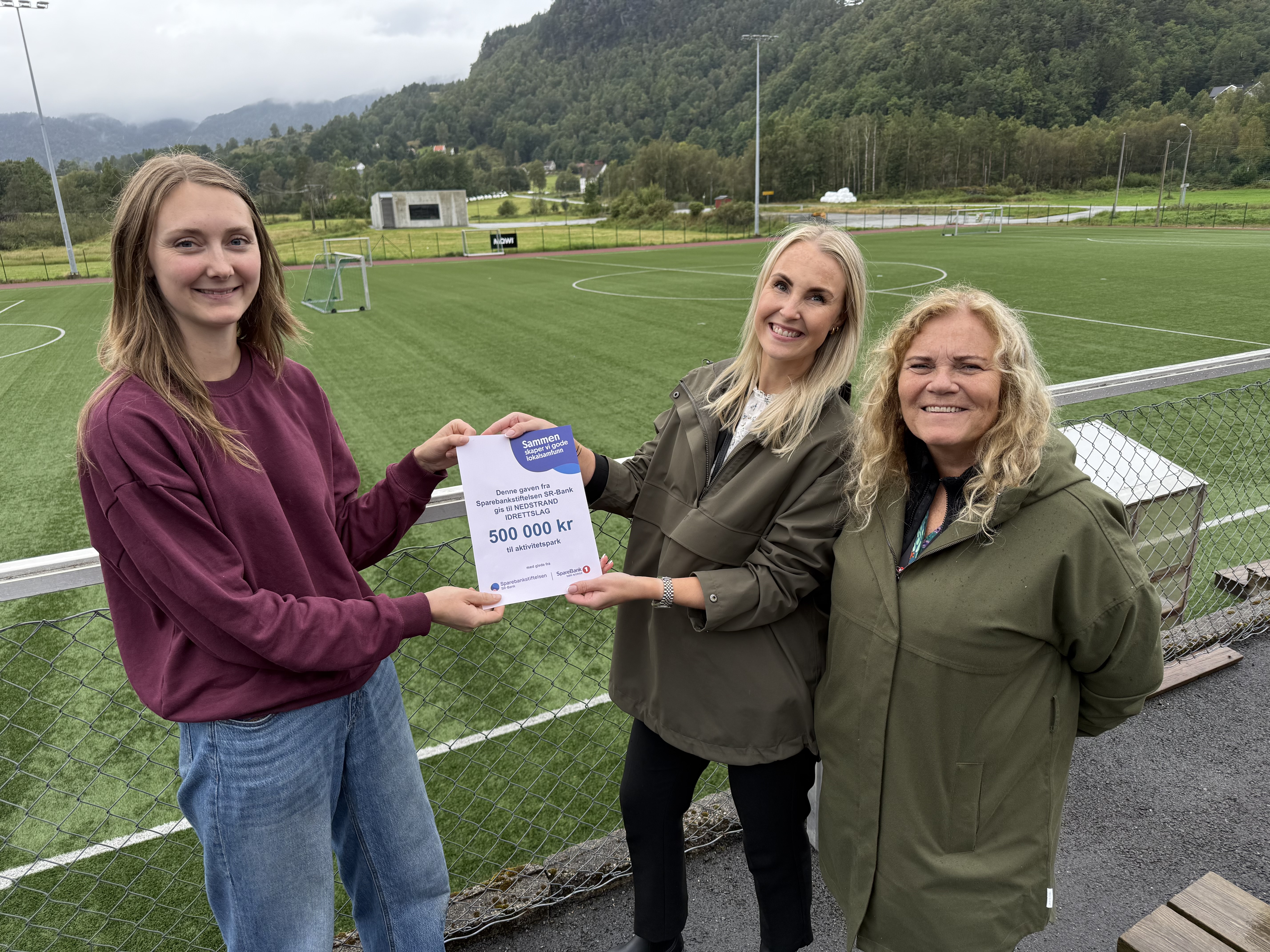 Mandag tildelte Sparebankstiftelsen 500.000 kroner til Nedstrand IL, her representert ved Malin Mæland (t.v). Banksjef Inger Rossebø (t.h) og Kristine Heiland Brekke fra SpareBank1 Sør-Norge heier på tiltaket som fremmer aktivitet for barn og unge.