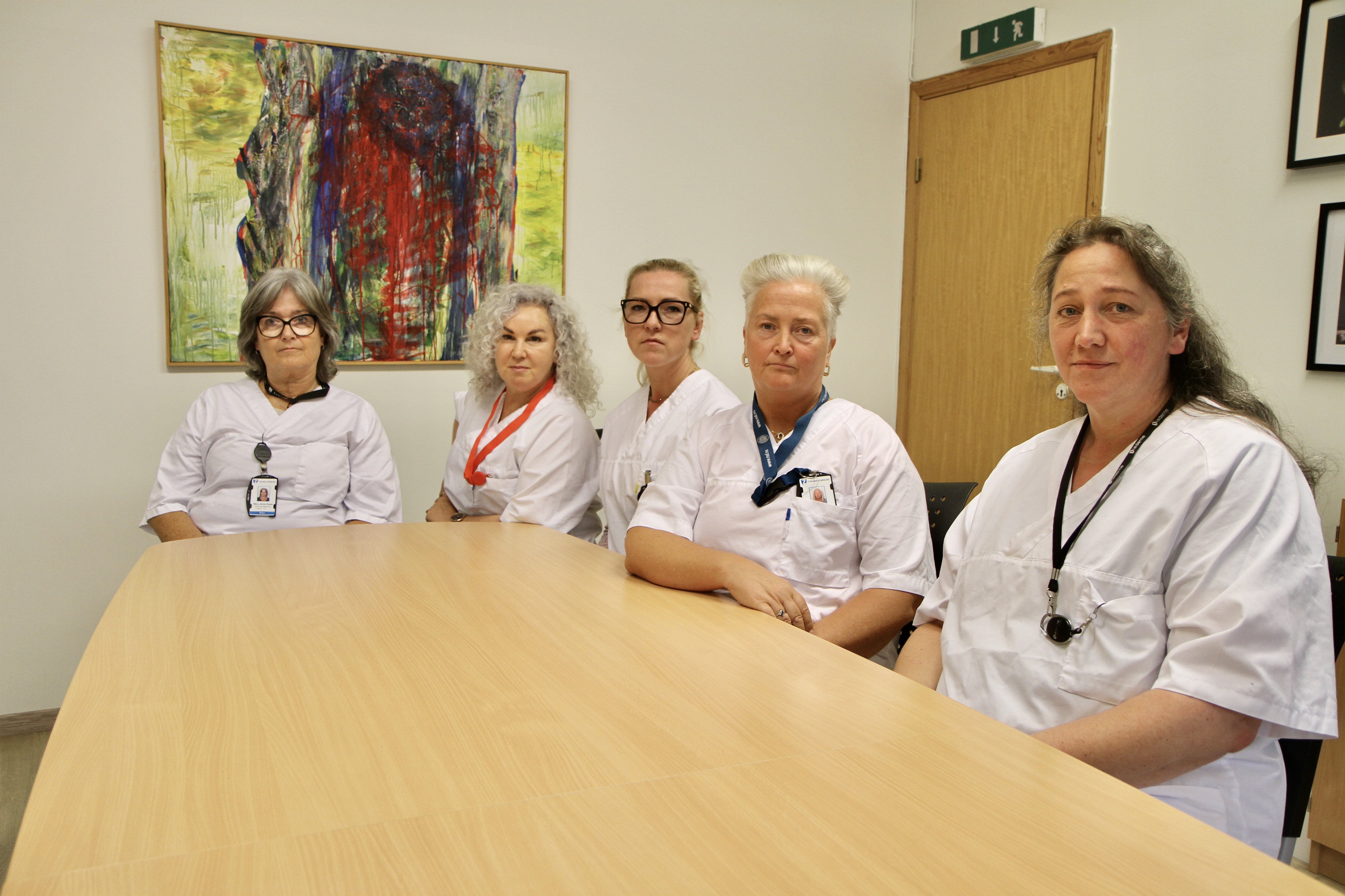 – Vi har protestert på avtalen siden vi ble informert om den, forteller sykepleier Anne-Lise Thorstensen Nes om samarbeidsavtalen de ble presentert i mai. F.v: Mary Janne Rojas, Gitana Fresdorfiene, Hunoreta Pakalniene, Anne-Lise Thorstensen Nes og Sylvia Charlotte Helvik.