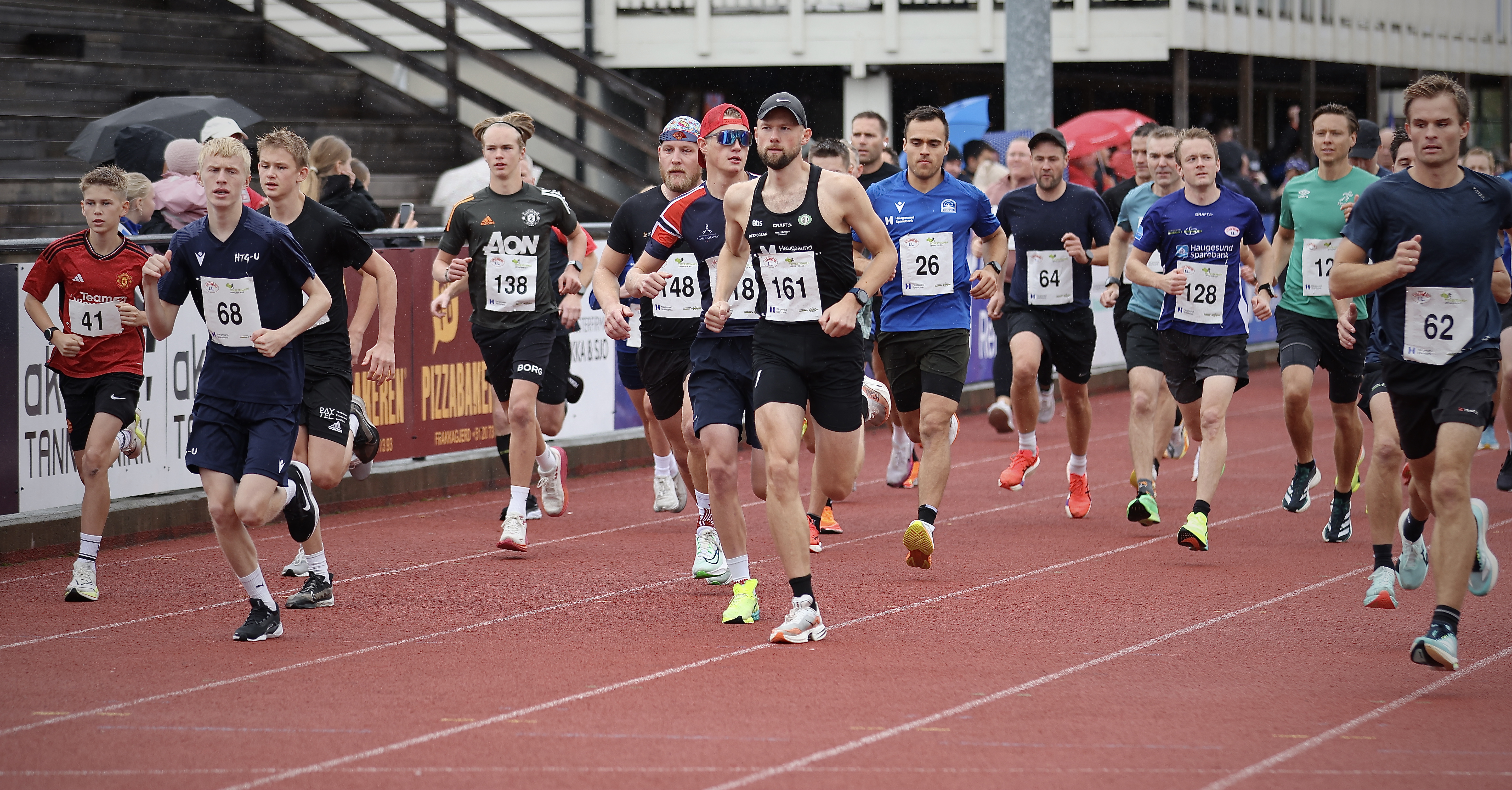 Kristoffer Nordhus (161) i tet allerede fra start. Bak han med rød caps nummer tre Mathias Wiik Hovda. Nummer to ble Stegaberg-løperen og haugesunderen Eirik renna Eilertsen med startnummer 62. Foto: Alf-Einar Kvalavåg