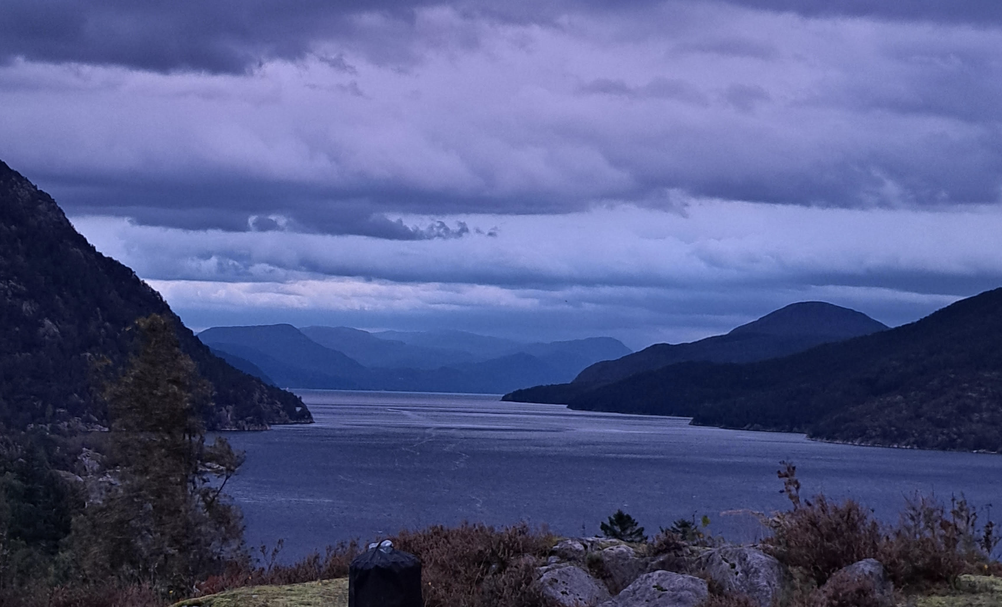 Den kraftige vinden har gjort at mange har vært uten strøm det siste halve døgnet. Her er er bilde fra Yrke som viser fjorden og himmelen da uværet bygget seg opp. Foto: Eli Margrete Stølsvik