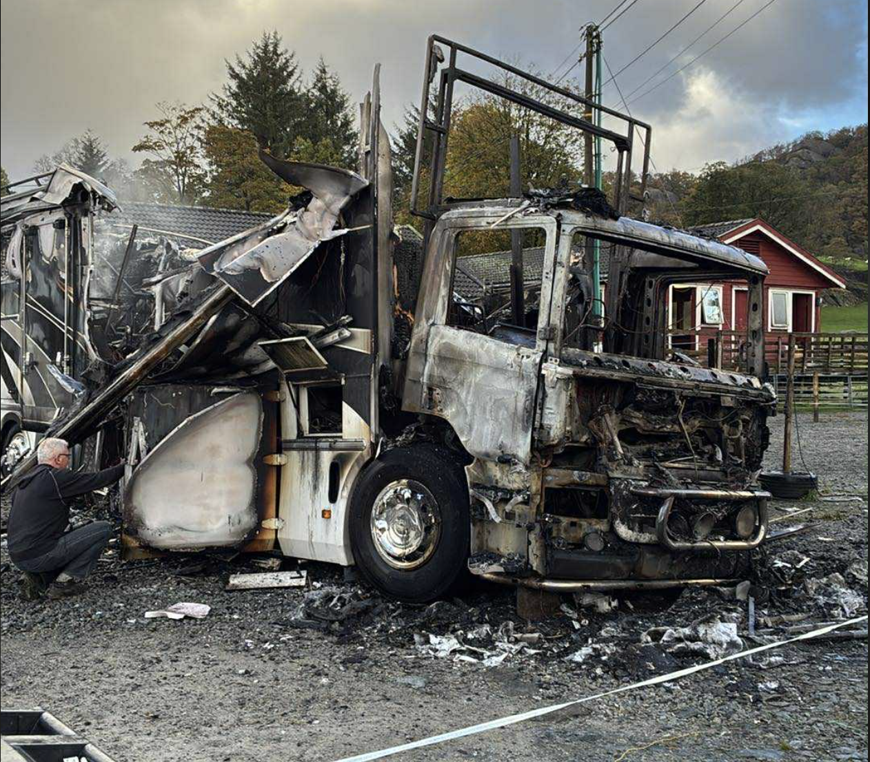 Dette er det sørgelege synet dagen derpå. Brannmannskap måtte ta ein kontrollert nedbrenning.