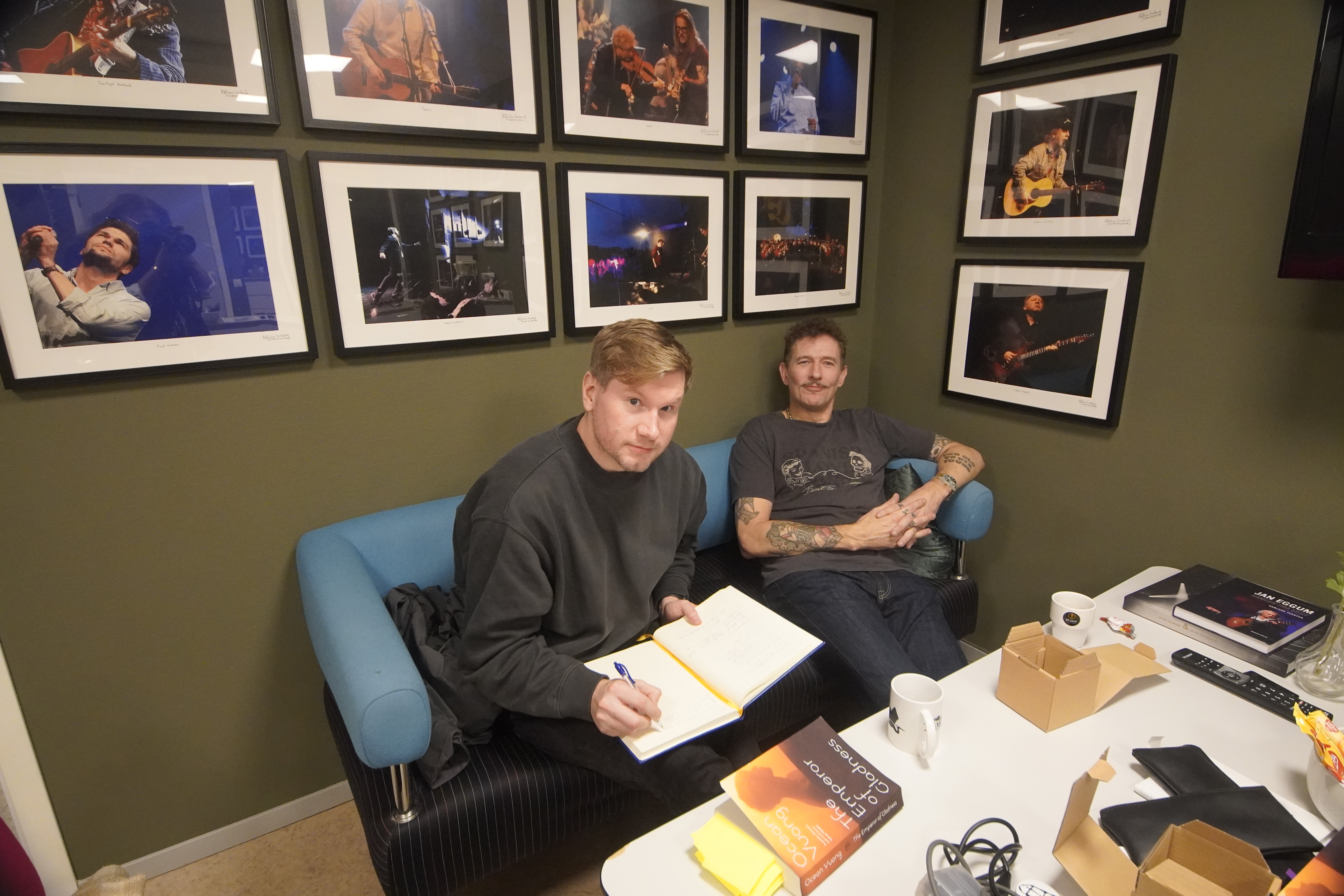 Alexander Sandtorv og Kristopher Schau laga live podcast om bøker frå scena i Tysværtunet.
